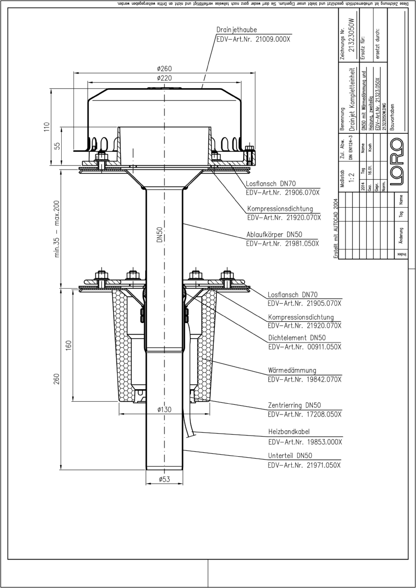LORO-X DRAINJET Flachdach-Schnellablauf, Serie 49(DJ) zweiteilig mit Wärmedämmung und Heizung, Auslauf senkrecht, für Notentwässerung mit Druckströmung, Abflussleistung 9,0 l/s bei 75 mm Wasserhöhe auf dem Dach, mit Klemmflansch als Los- und Festflanschkonstruktion inklusive Kompressionsdichtungen, für Bitumen und Kunststoff Abdichtungsbahnen, DRAINJET-Haube aus Edelstahl, nach DIN EN 1253 mit erhöhtem Qualitätsstandard gemäß RAL-Gütezeichen GZ-694, Leistungsnachweis mit normgerechtem Prüfsystem mit 4,2m nicht belüfteter Fallleitung gemäß LX-Datenblatt LX1340, aus Edelstahl, DN 50