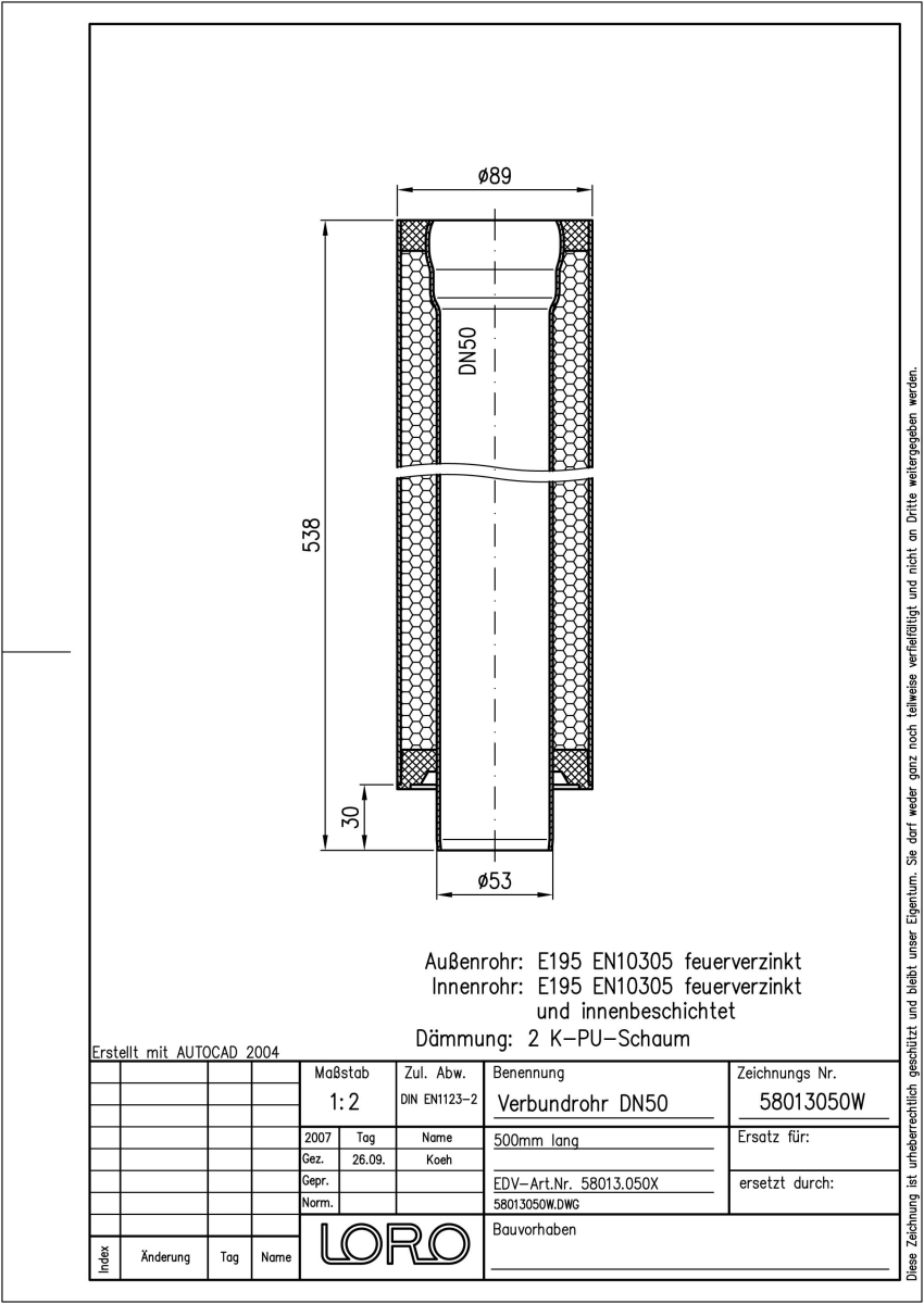 LORO-X Verbundrohr bestehend aus Innenrohr (LORO-X Rohr, aus Stahl feuerverzinkt, nach DIN EN 1123, mit erhöhtem Qualitätsstandard gemäß RAL-Gütezeichen GZ-694, mit 2-Kammern-Steckmuffenverbindung, Baustoffklasse A1, formstabil, bruchfest, rückstausicher, langlebige Innenbeschichtung gemäß DIN EN ISO 2178 auf Basis einer 2K-Epoxid-Kombination, Farbton: Rotbraun), Dämmschicht (PU-Hartschaum B2, FCKW-frei) und Außenrohr (LORO-X Rohr, aus Stahl, feuerverzinkt), 500 mm lang, DN 50