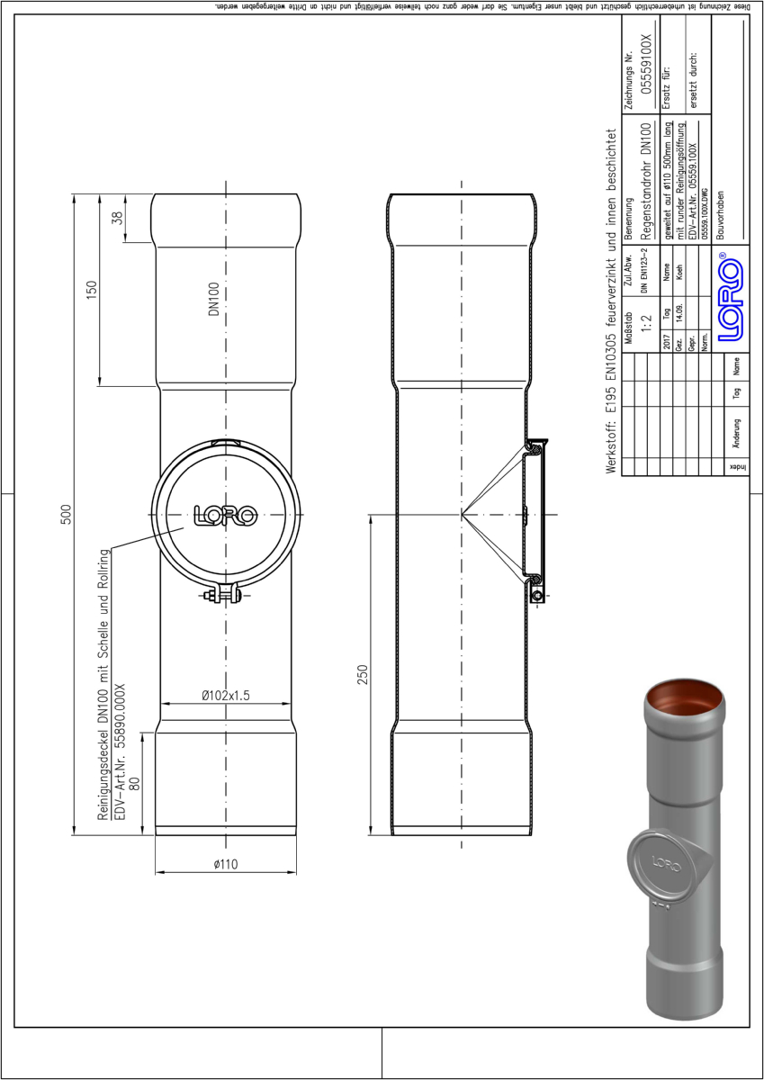 LORO-X Sanierungs-Regenstandrohr, aus Stahl, feuerverzinkt, rund, mit Reinigungsöffnung nach DIN EN 1123 mit erhöhtem Qualitätsstandard gemäß RAL-Gütezeichen, mit 2-Kammern-Steckmuffenverbindung, Baustoffklasse A1, formstabil, bruchfest, rückstausicher, langlebige Innenbeschichtung gemäß DIN EN ISO 2178 auf Basis einer 2K-Epoxid-Kombination, Farbton: Rotbraun, mit Auslauf 110 mm zum Übergang auf die Grundleitung aus Gussrohr oder auf Kunststoffrohr, 500 mm, DN 100