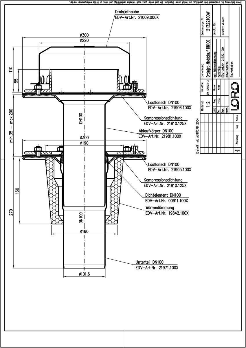 LORO-X DRAINJET Flachdach-Schnellablauf, Serie 49(DJ) zweiteilig mit Wärmedämmung, Auslauf senkrecht, für Notentwässerung mit Druckströmung, Abflussleistung 38,0 l/s bei 75 mm Wasserhöhe auf dem Dach, mit Klemmflansch als Los- und Festflanschkonstruktion inklusive Kompressionsdichtungen, für Bitumen und Kunststoff Abdichtungsbahnen, DRAINJET-Haube aus Edelstahl, nach DIN EN 1253 mit erhöhtem Qualitätsstandard gemäß RAL-Gütezeichen GZ-694, Leistungsnachweis mit normgerechtem Prüfsystem mit 4,2m nicht belüfteter Fallleitung gemäß LX-Datenblatt LX542, aus Edelstahl, DN 100