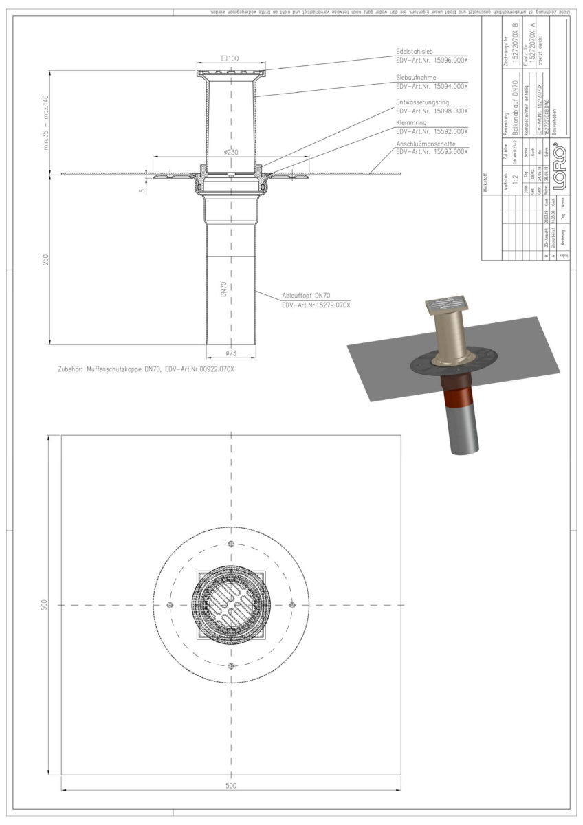LORO-X Balkonablauf, Serie F, einteilig ohne Wärmedämmung, Auslauf senkrecht, mit vormontierter Anschlussmanschette aus Bitumen EPDM Verbund, nach DIN EN 1253 mit erhöhtem Qualitätsstandard gemäß RAL-Gütezeichen GZ-694, aus Stahl feuerverzinkt, mit langlebiger Beschichtung gemäß DIN EN ISO 2178 auf Basis einer 2K-Epoxid-Kombination, Farbton: Rotbraun, bestehend aus Ablauftopf, Anschlussmanschette, Klemmring, Entwässerungsring, Siebaufnahme 100 x 100 mm (für Aufbauhöhe 35 - 140 mm), Edelstahlsieb DN 70
