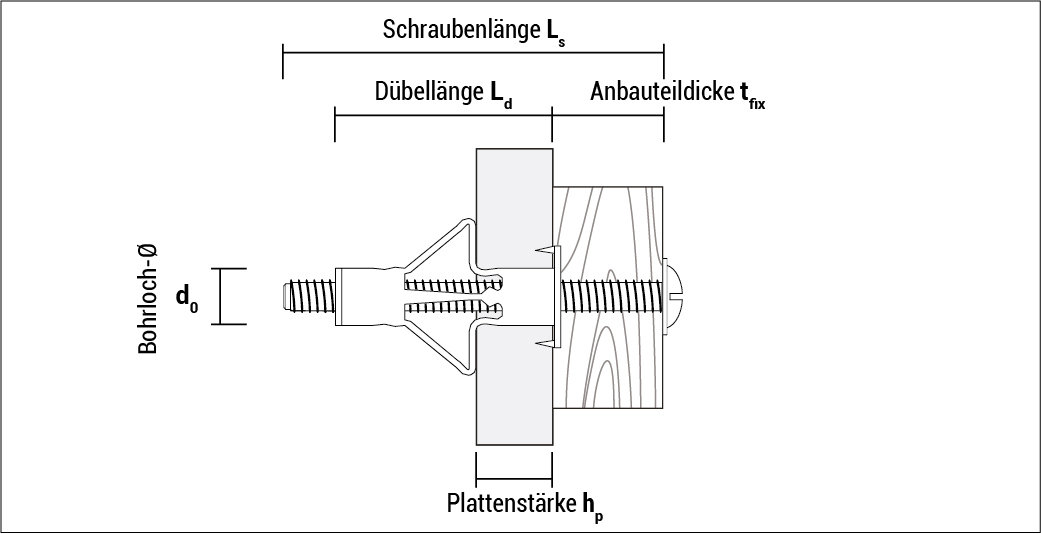 - Geeignet für Befestigungen auf Plattenbaustoffen, z.B. Gipskarton- oder Spanplatten, aber auch z. B. in Hohldecken