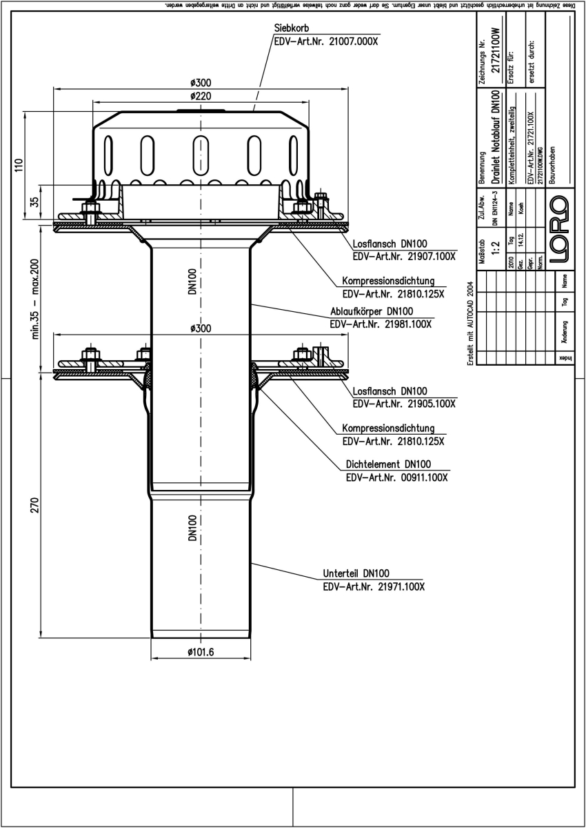 LORO-X DRAINLET Flachdachablauf, Serie 84(DL) zweiteilig ohne Wärmedämmung, Auslauf senkrecht, für Notentwässerung mit Freispiegelströmung, Abflussleistung 9,0 l/s bei 75 mm Wasserhöhe auf dem Dach, mit Klemmflansch als Los- und Festflanschkonstruktion inklusive Kompressionsdichtungen, für Bitumen- und Kunststoff- Abdichtungsbahnen, DRAINLET-Haube aus Edelstahl, nach DIN EN 1253 mit erhöhtem Qualitätsstandard gemäß RAL-Gütezeichen GZ-694, Leistungsnachweis mit normgerechtem Prüfsystem mit 4,2m nicht belüfteter Fallleitung gemäß LX-Datenblatt LX875, aus Edelstahl, DN 100