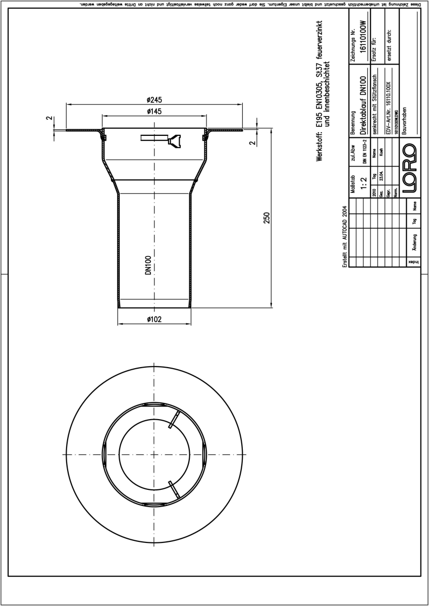 LORO-X Balkondirektablauf, Serie GF mit Stützrand, Auslauf senkrecht, für Abdichtung mit Flüssigkunststoffen/Verbundabdichtungen, für Belag von 2 - 3 mm, nach DIN EN 1253 mit erhöhtem Qualitätsstandard gemäß RAL-Gütezeichen GZ-694, aus Stahl feuerverzinkt, mit langlebiger Beschichtung gemäß DIN EN ISO 2178 auf Basis einer 2K-Epoxid-Kombination, Farbton: Rotbraun, ohne Sieb, DN 100
