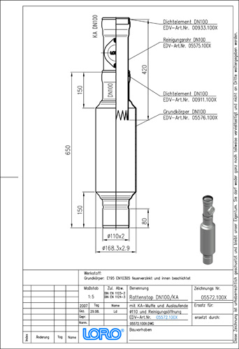 LORO-X Rattenstopp aus Stahl, feuerverzinkt, mit Reinigungsöffnung, nach DIN EN 1123 mit erhöhtem Qualitätsstandard gemäß RAL-Gütezeichen, mit 2-Kammern-Steckmuffenverbindung, Baustoffklasse A1, formstabil, bruchfest, rückstausicher, langlebige Innenbeschichtung gemäß DIN EN ISO 2178 auf Basis einer 2K-Epoxid-Kombination, Farbton: Rotbraun, aufgeweitetes Rohr mit innenliegenden spitzen Zacken, wodurch den Ratten und Tieren ein Hinaufklettern verhindert wird. Auslaufende 110mm Durchmesser, DN 100.