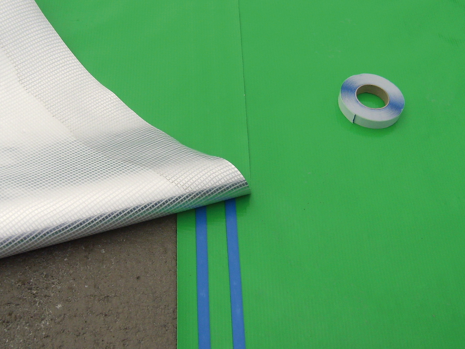 Vierlagige Radonsperre, bestehend aus zwei Lagen PE-Folie, einem eingelegten Polyesterfasernetz und einer Aluminiumschicht mit 0,008 mm Dicke.