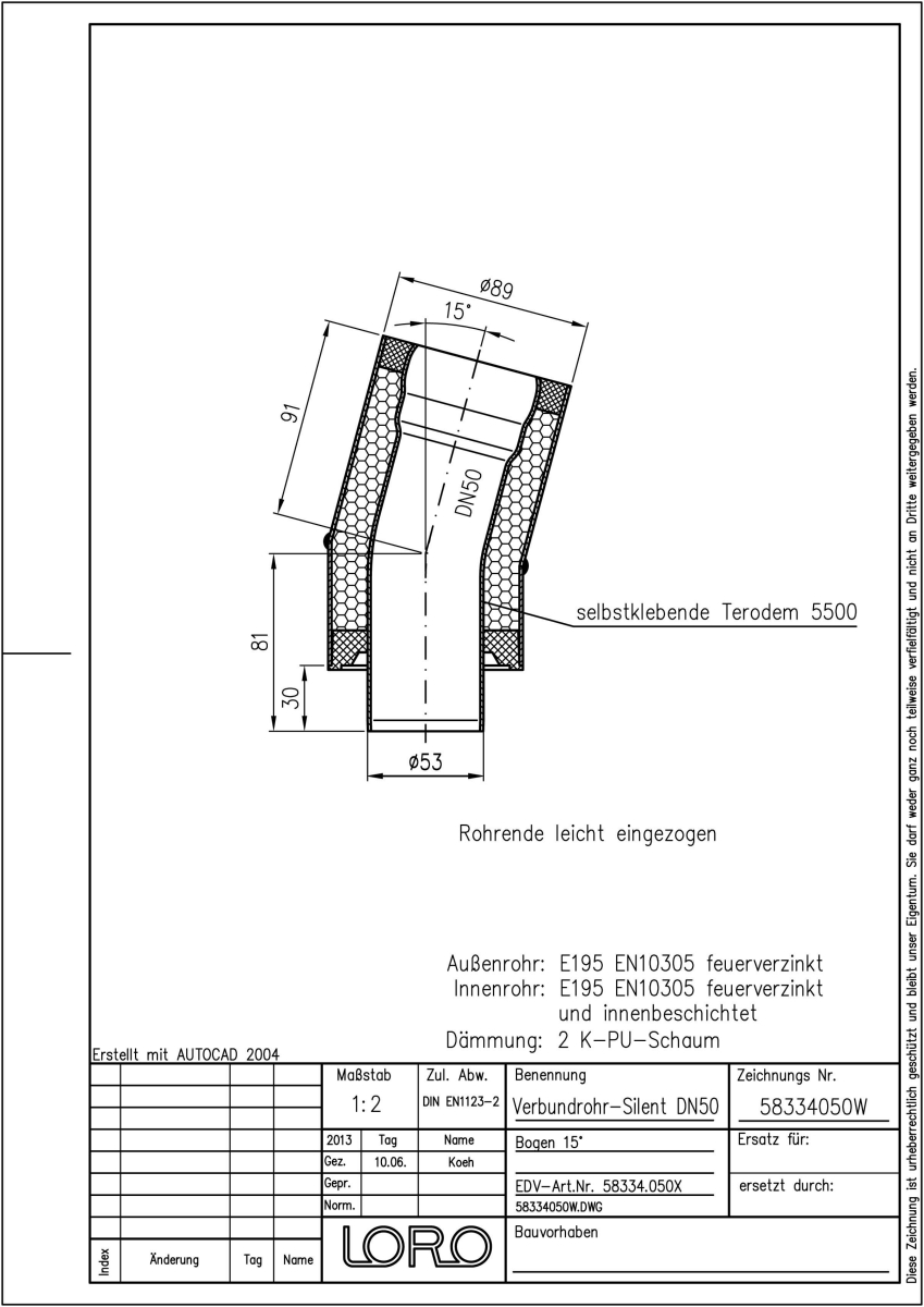 LORO-X Verbundrohr-Bogen, Ausführung SILENT, für erhöhte Schalldämmung, bestehend aus: Innenrohr (LORO-X Rohr, aus Stahl, feuerverzinkt, nach DIN EN 1123, mit erhöhtem Qualitätsstandard gemäß RAL-Gütezeichen GZ-694, mit 2-Kammern-Steckmuffenverbindung, Baustoffklasse A1, formstabil, bruchfest, rückstausicher, langlebige Innenbeschichtung gemäß DIN EN ISO 2178 auf Basis einer 2K-Epoxid-Kombination, Farbton: Rotbraun), Schallschutzmatte (am Innenrohr angebracht), Dämmschicht (PU-Hartschaum B2, FCKW-frei) und Außenrohr (LORO-X Rohr, feuerverzinkt) 15 Grad, DN 50