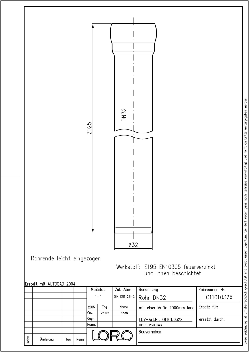 LORO-X Rohr, aus Stahl, feuerverzinkt, nach DIN EN 1123 mit erhöhtem Qualitätsstandard gemäß RAL-Gütezeichen GZ-694, mit 2-Kammern-Steckmuffenverbindung, Baustoffklasse A1, formstabil, bruchfest, rückstausicher, langlebige Innenbeschichtung gemäß DIN EN ISO 2178 auf Basis einer 2K-Epoxid-Kombination, Farbton: Rotbraun, 2000 mm, + 1 Muffe, DN 32