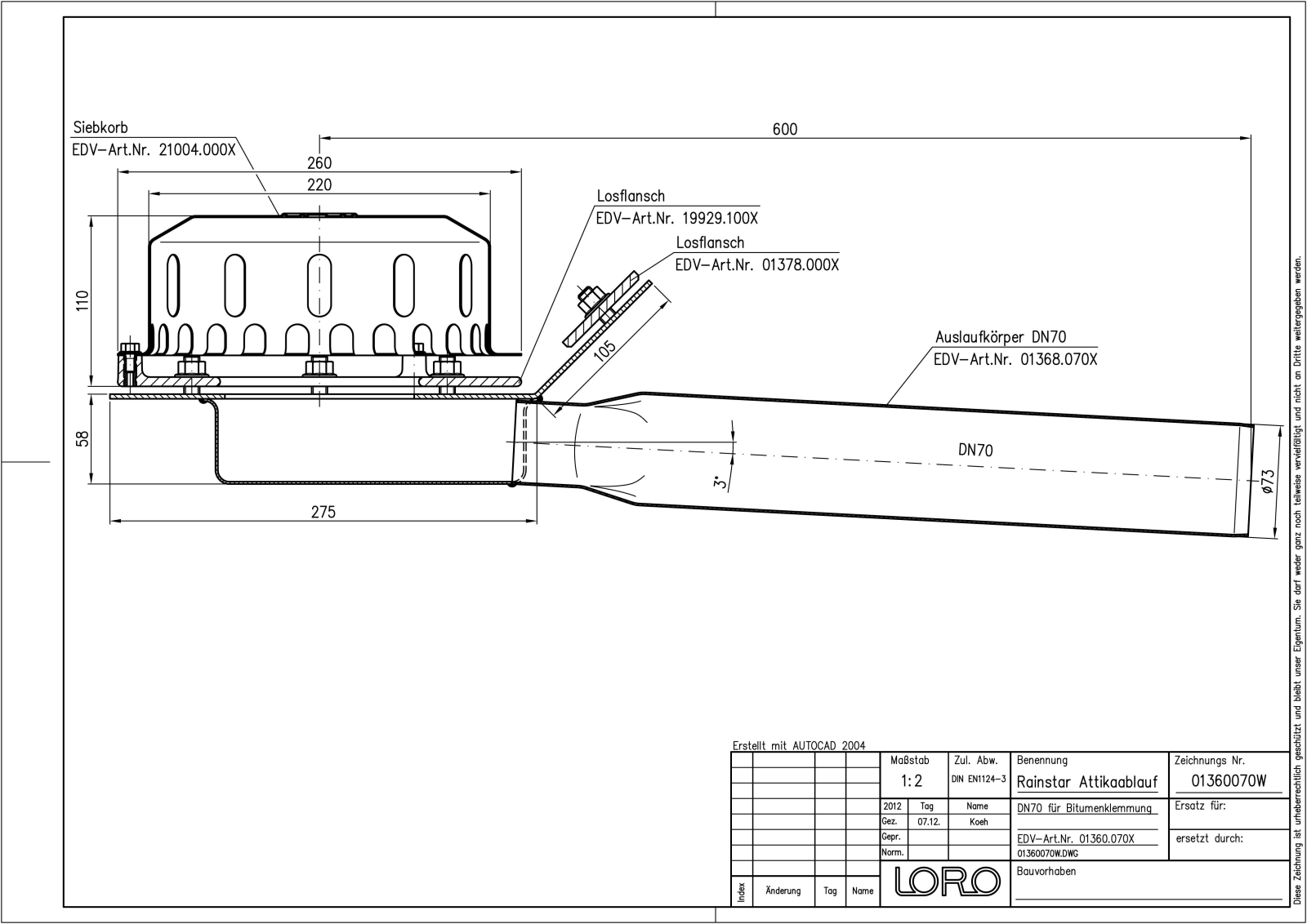 LORO-X RAINSTAR Attikaablauf, Serie 89 mit geringer Einbautiefe, für Hauptentwässerung mit Freispiegelströmung, Abflussleistung 5,0 l/s bei 35 mm Wasserhöhe auf dem Dach, mit Klemmflansch, als Los- und Festflanschkonstruktion, 45 Grad Aufkantung für Bitumen-Abdichtungsbahnen, Eingrifftiefe 55 mm, mit DRAINLET-Haube aus Edelstahl, nach DIN EN 1253, Leistungsnachweis mit normgerechtem Prüfsystem mit 4,2m nicht belüfteter Fallleitung gemäß Systemdatenblatt LX471, aus Edelstahl, DN 70