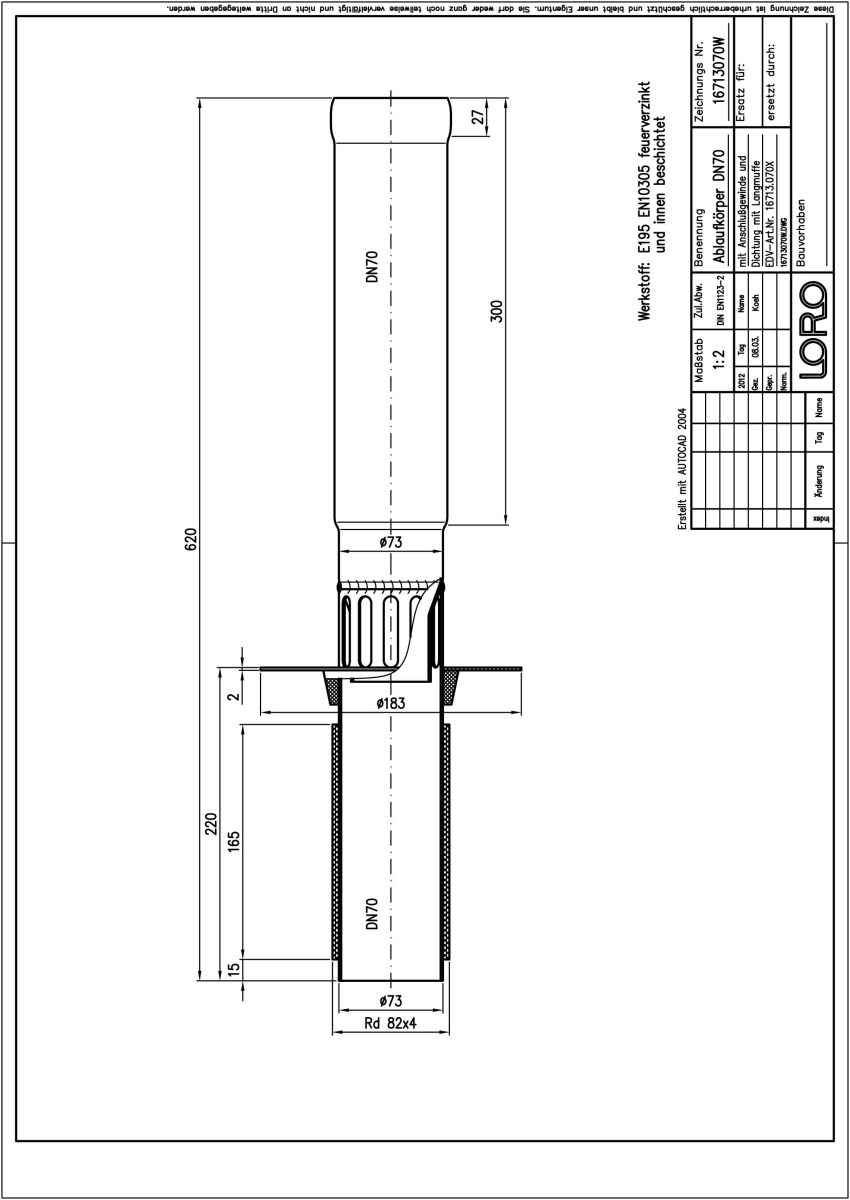 LORO-VERSAL Direktablaufkörper mit Stützrand, mit Langmuffe, Anschlussgewinde und Dichtung, Serie J, für Balkongeschosse und untere Balkone, aus Stahl, feuerverzinkt , langlebige Innenbeschichtung gemäß DIN EN ISO 2178 auf Basis einer 2K-Epoxid-Kombination, Farbton: Rotbraun, für Deckenstärke 100 - 170 mm, DN 70
