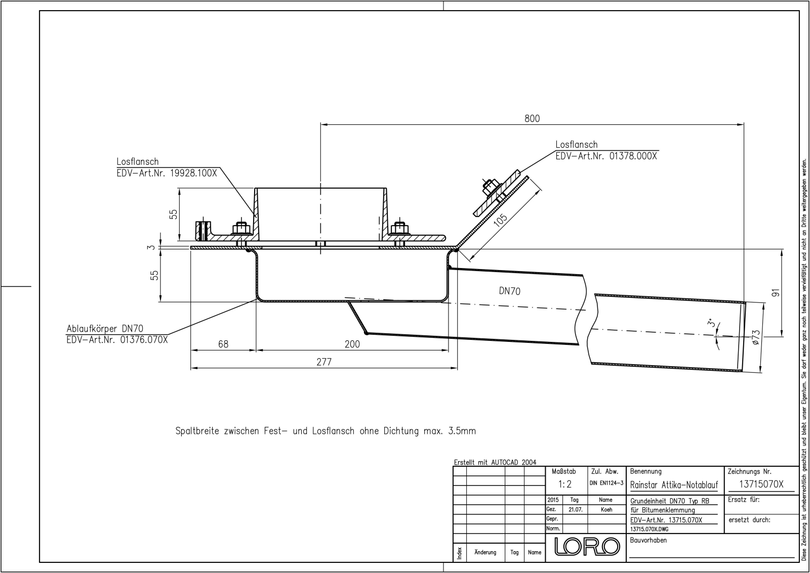mit Klemmflansch als Los- und Festflanschkonstruktion für Bitumen-Abdichtungsbahnen aus Edelstahl DN 70