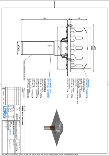 LORO-X Flachdachablauf, Serie O einteilig ohne Wärmedämmung, Auslauf senkrecht, für Hauptentwässerung mit Freispiegelströmung, Abflussleistung 4,6 l/s bei 35 mm Wasserhöhe auf dem Dach, mit Anschlussmanschette aus Bitumen/EPDM Verbund, Siebeinheit aus Edelstahl, nach DIN EN 1253 mit erhöhtem Qualitätsstandard gemäß RAL-Gütezeichen GZ-694, Leistungsnachweis mit normgerechtem Prüfsystem mit 4,2m nicht belüfteter Fallleitung gemäß LX-Datenblatt LX887, aus Stahl, feuerverzinkt, DN 70