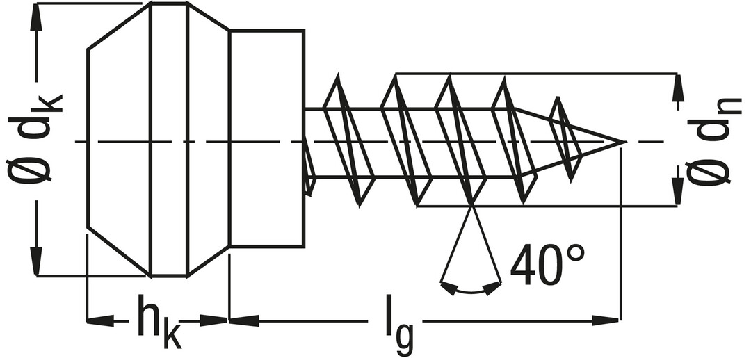 - Scharfes, breittragendes 40º-Gewinde, bis unter den Kopf