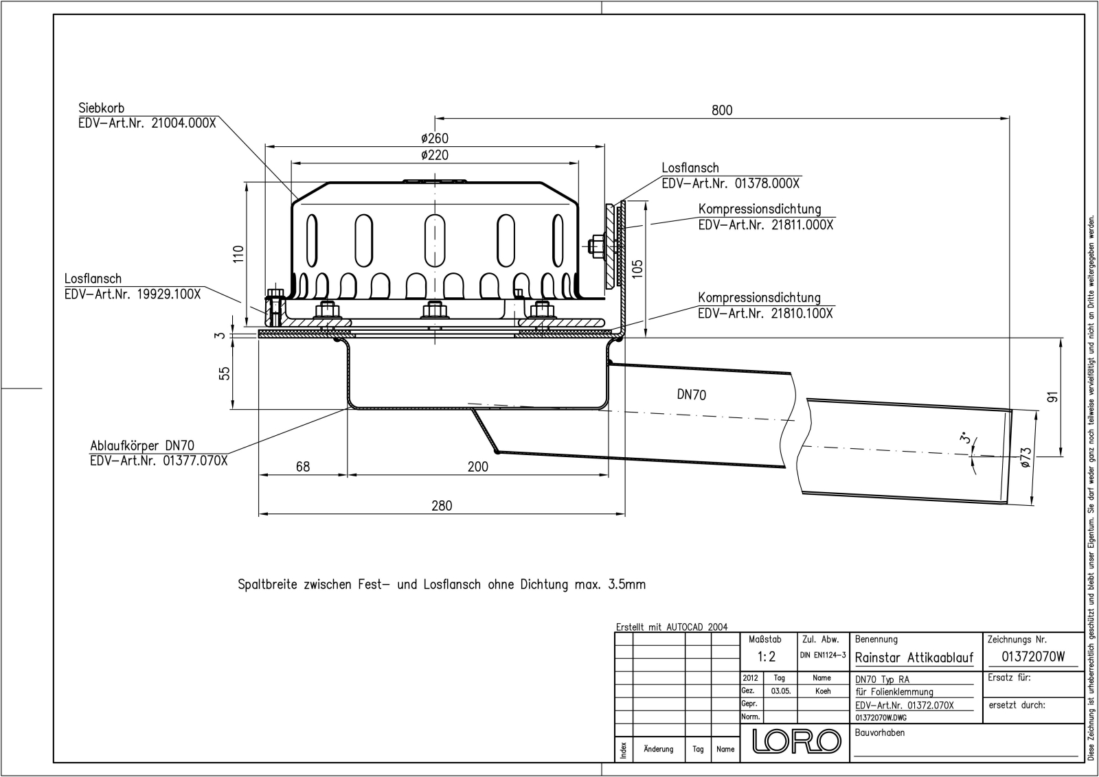 LORO-X RAINSTAR Attikaablauf, Serie 79 (RA) mit tiefgelegtem Rohr, für Hauptentwässerung mit Freispiegelströmung, Abflussleistung 5,2 l/s bei 35 mm Wasserhöhe auf dem Dach, mit Klemmflansch, als Los- und Festflanschkonstruktion, 90 Grad Aufkantung für Kunststoff-Abdichtungsbahnen, Eingrifftiefe 92 mm, mit DRAINLET-Haube aus Edelstahl, nach DIN EN 1253, Leistungsnachweis mit normgerechtem Prüfsystem mit 4,2m nicht belüfteter Fallleitung gemäß Systemdatenblatt LX460, aus Edelstahl, DN 70