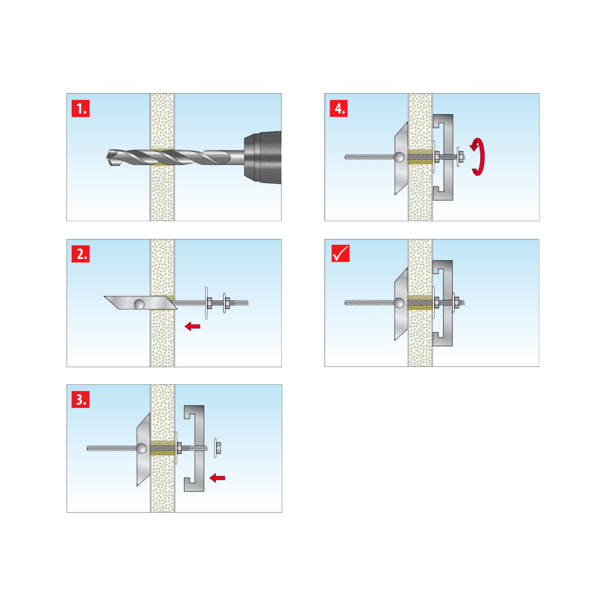 - Galvanisch verzinkter Hohlraumdübel aus Metall mit einem Kippflügel, Gewindestange, einer großen und einer kleinen Unterlegscheibe aus Metall und zwei Sechskantmuttern (SW 13)