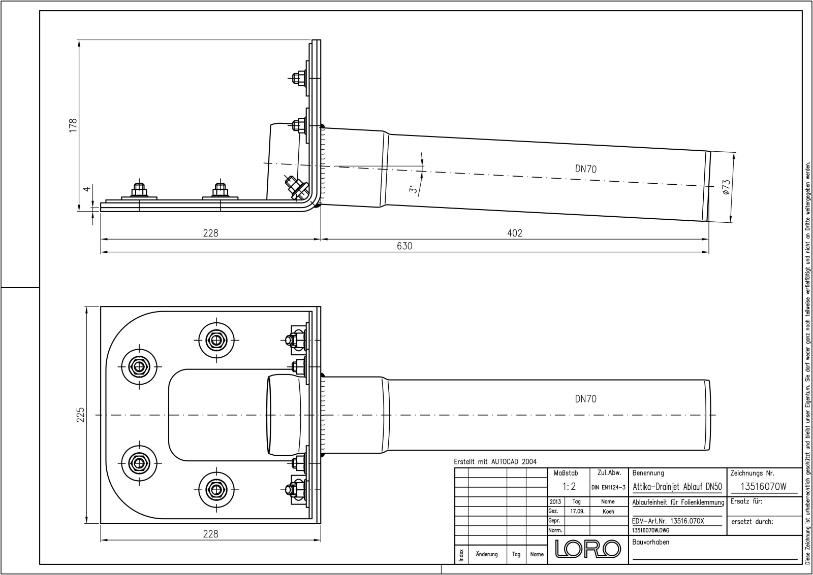 ohne Eingriff ins Dach mit Klemmflansch und 90 Aufkantung für Kunststoff-Dachabdichtungsbahnen aus Edelstahl DN 70