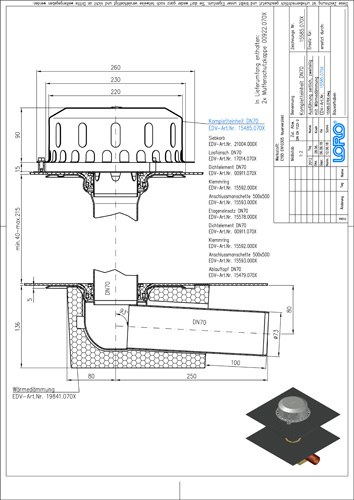 LORO-X Flachdachablauf, Serie O zweiteilig mit Wärmedämmung, Auslauf seitlich 3 Grad, für Hauptentwässerung mit Freispiegelströmung, Abflussleistung 4,2 l/s bei 35 mm Wasserhöhe auf dem Dach, mit Anschlussmanschette aus Bitumen/EPDM Verbund, Siebeinheit aus Edelstahl, nach DIN EN 1253 mit erhöhtem Qualitätsstandard gemäß RAL-Gütezeichen GZ-694, Leistungsnachweis mit normgerechtem Prüfsystem mit 4,2m nicht belüfteter Fallleitung gemäß LX-Datenblatt LX886, aus Stahl, feuerverzinkt, DN 70
