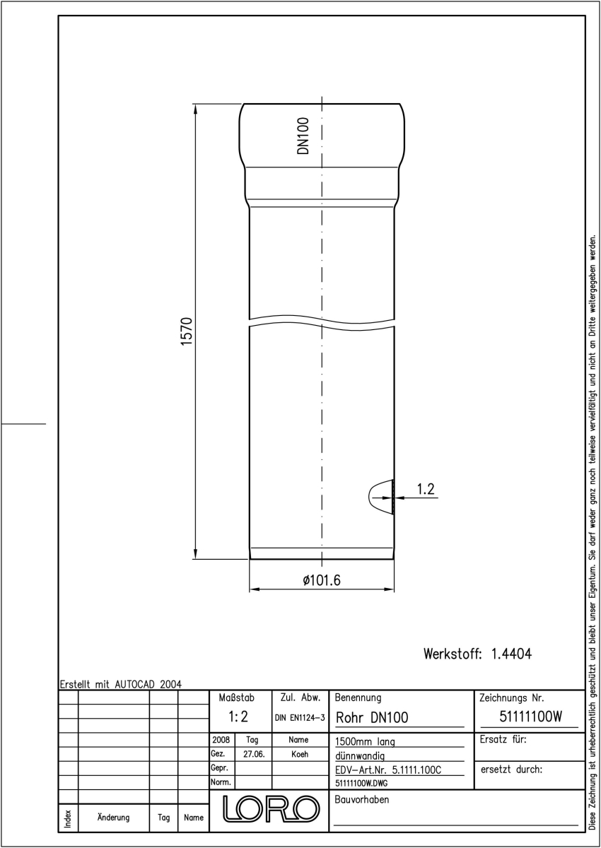 LORO-XCL Rohr, aus Edelstahl, Werkstoff Nr. 1.4404, gebeizt und passiviert, nach DIN EN 1124 mit erhöhtem Qualitätsstandard gemäß RAL-Gütezeichen GZ-694, mit 2-Kammern-Steckmuffenverbindung, Baustoffklasse A1, formstabil, bruchfest, rückstausicher, 1500 mm, + 1 Muffe, DN 100