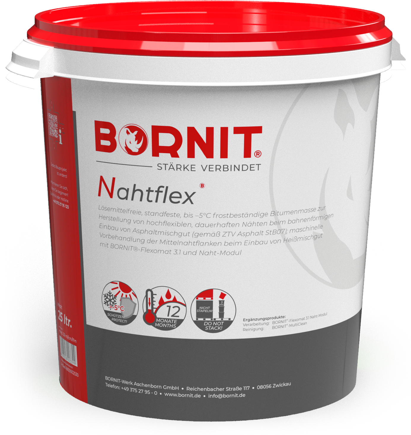 Hochflexible, thixotrope (standfeste), bis -5°C lagerfähige Bitumenmasse, zur Herstellung von flexiblen und dauerhaften Nähten beim bahnenförmigen Einbau von Asphaltmischgut (gemäß ZTV Asphalt StB07), hohe Bruchdehnung, rissüberbrückend. Kann mit Spachtel oder dem BORNIT®-Flexomat 3.1 aufgetragen werden. Je nach Verarbeitungsgerät können Schichtdicken bis 4 mm aufgebracht werden.