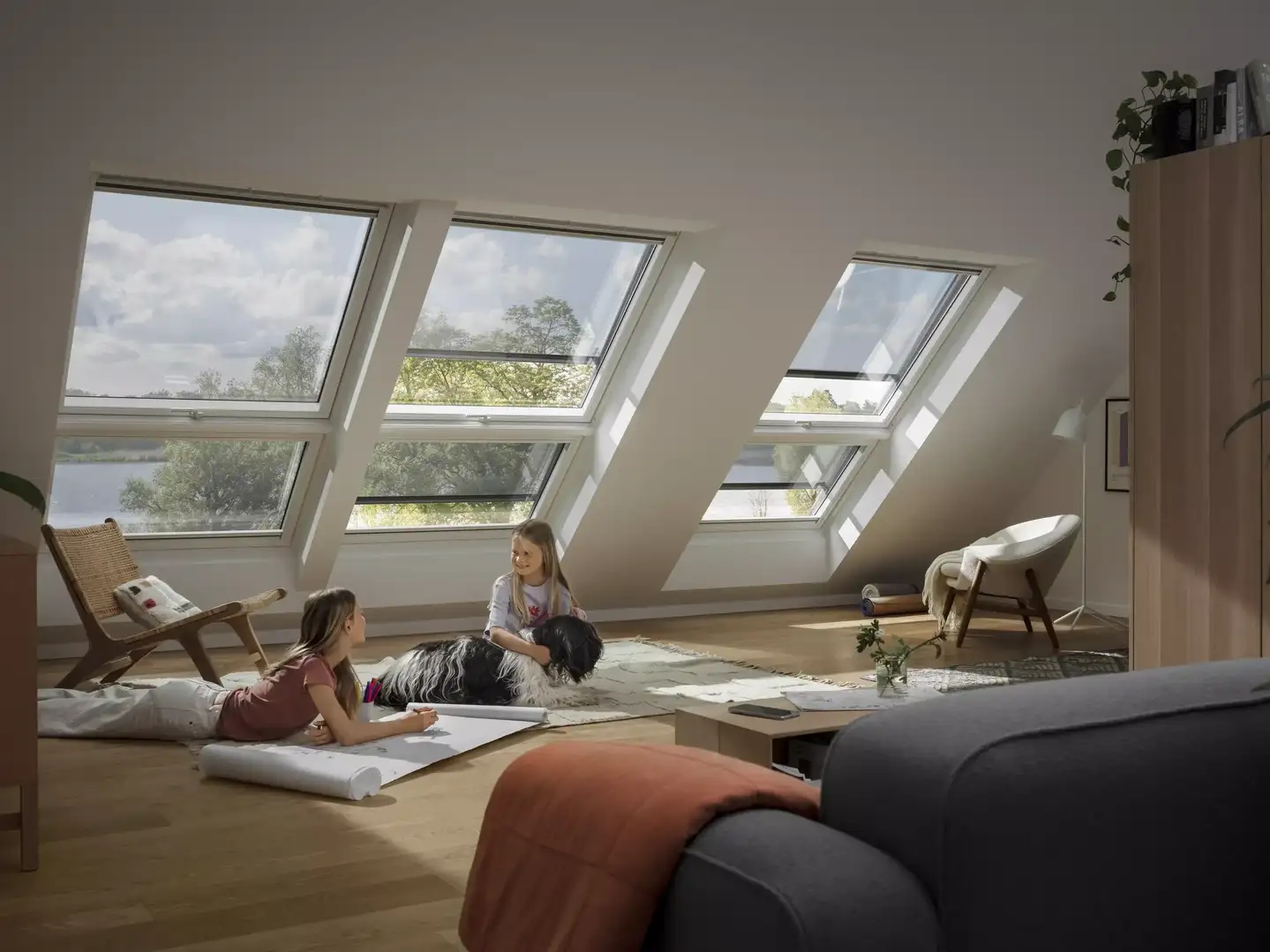 Innenfutter für 2 Fenster nebeneinander eingebaut mit Zusatzelementen GIU/GIL als Lichtlösung QUARTETT mit Kombi-Eindeckrahmen unter Verwendung des Hilfssparrens EKY.