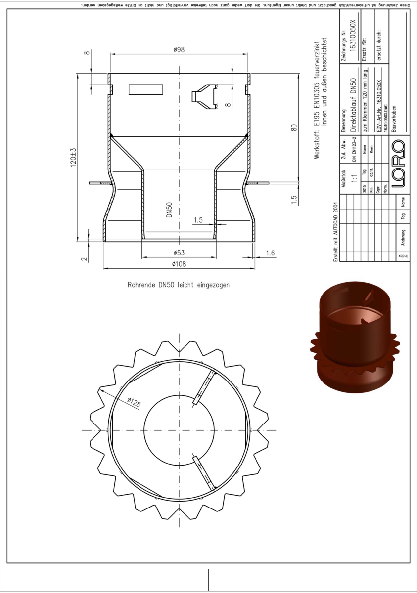 LORO-X Balkondirektablauf, Serie IK mit Glocke und Klemmkragen, Auslauf senkrecht, nach DIN EN 1253 mit erhöhtem Qualitätsstandard gemäß RAL-Gütezeichen GZ-694, aus Stahl feuerverzinkt, mit langlebiger Beschichtung gemäß DIN EN ISO 2178 auf Basis einer 2K-Epoxid-Kombination, Farbton: Rotbraun, für Plattenstärke 120 mm, ohne Sieb, DN 50