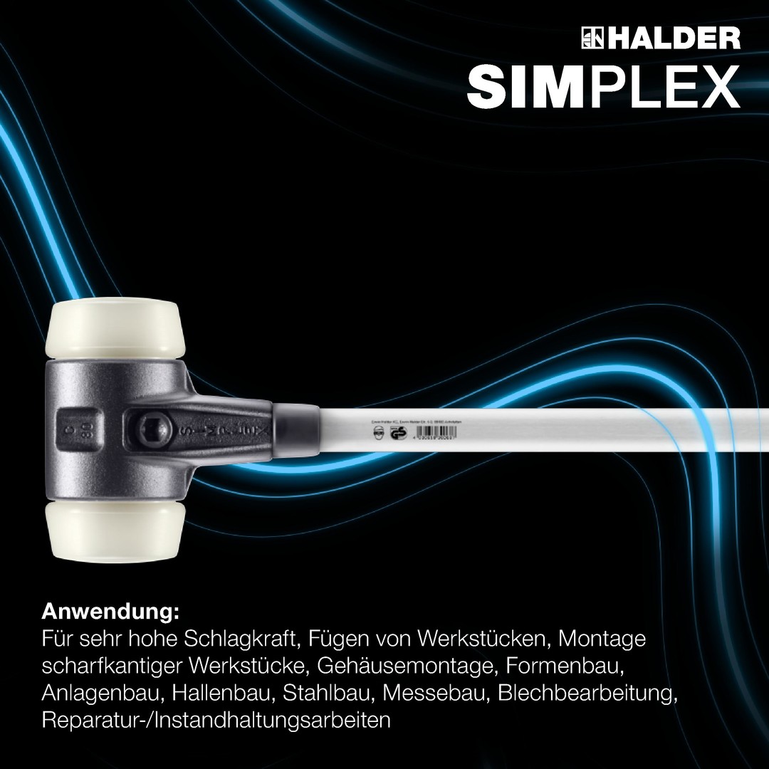 Bei diesem SIMPLEX–Schonhammer sind spezielle Schlageinsätze D50mm in das Gehäuse D40mm verbaut. Die überdimensionalen Schlagflächen ermöglichen einen maximalen Schutz für gefühlvolles Bearbeiten von Werkstücken mit empfindlichen Oberflächen.