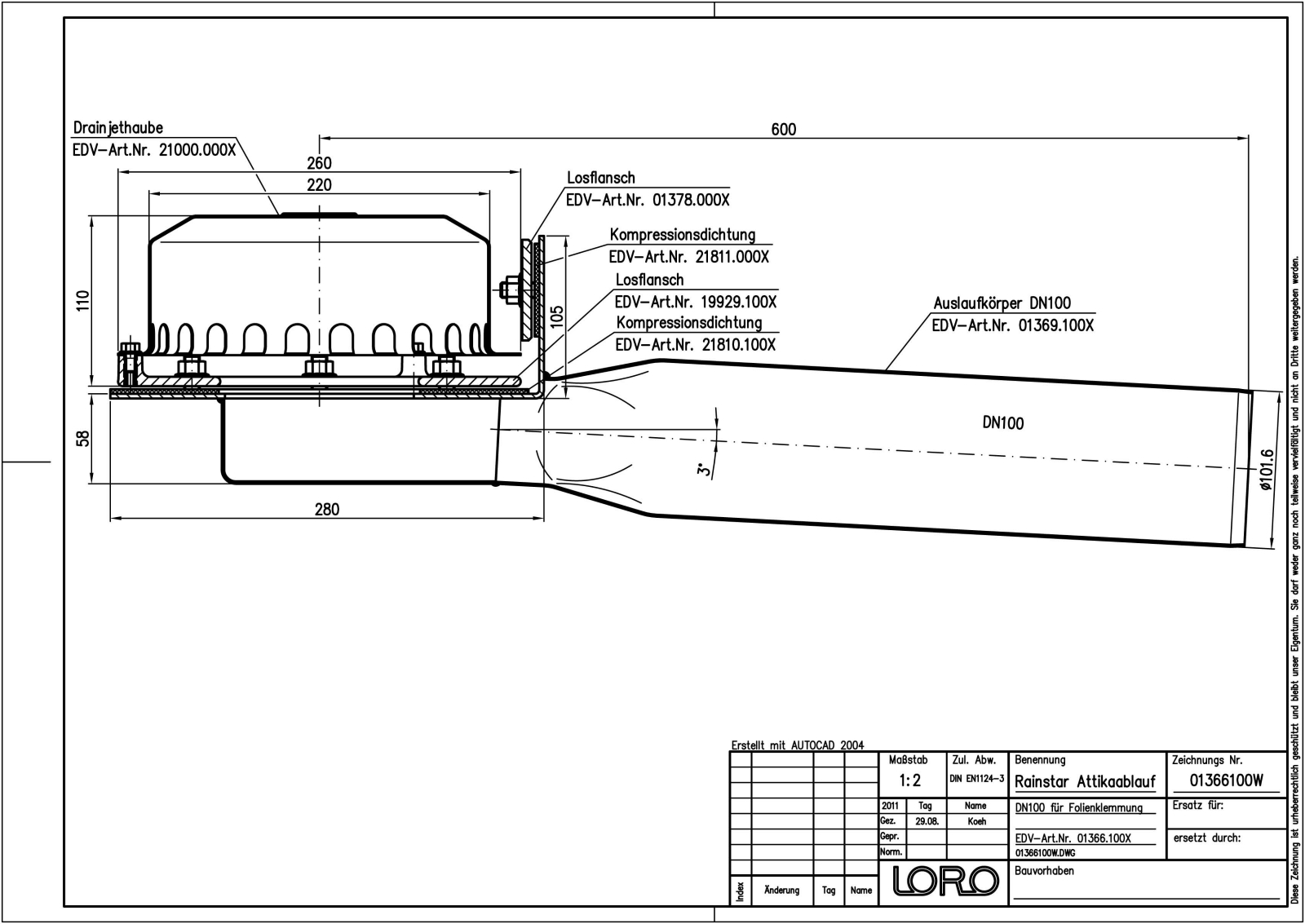 LORO-X RAINSTAR Attika-Schnellablauf, Serie 89 mit geringer Einbautiefe, für Hauptentwässerung mit Druckströmung, Abflussleistung 14,0 l/s bei 55 mm Wasserhöhe auf dem Dach, mit Klemmflansch, als Los- und Festflanschkonstruktion, 90 Grad Aufkantung für Kunststoff-Abdichtungsbahnen, Eingrifftiefe 55 mm, mit DRAINJET-Haube aus Edelstahl, nach DIN EN 1253, Leistungsnachweis mit normgerechtem Prüfsystem mit 4,2m nicht belüfteter Fallleitung gemäß Systemdatenblatt LX665, aus Edelstahl, DN 100