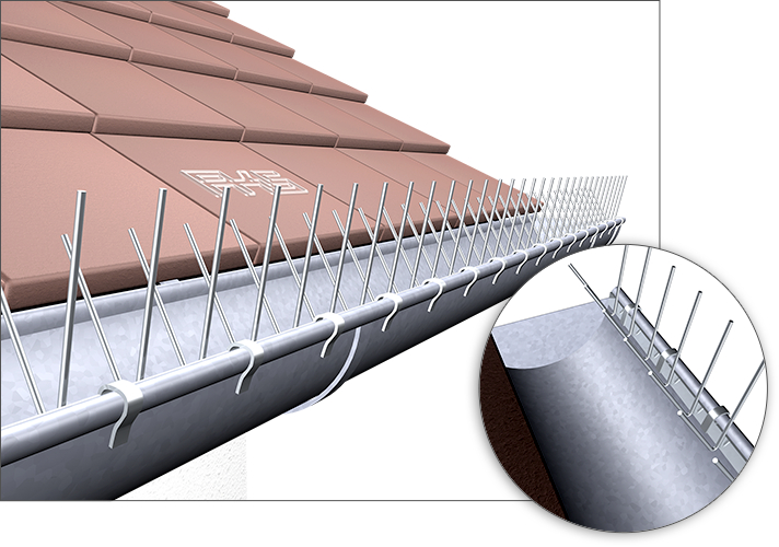 PIXX®- Rinne Lite ist speziell für Dachrinnen konzipiert und besteht aus einer 1 m langen Edelstahlleiste mit zweireihig V-förmig angeschweißten Edelstahlspikes.