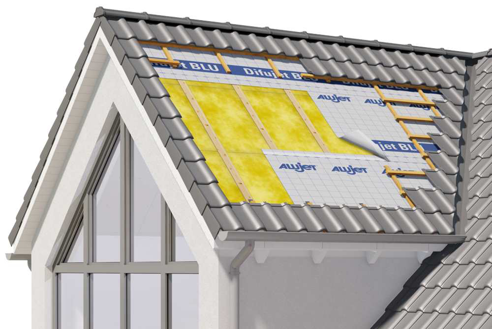 Die ALUJET Difujet BLU ist eine 3-lagige, diffusionsoffene Schalungsbahn und Unterdeckbahn. Sie ist die beste Basis zur Erstellung einer Behelfsdeckung.