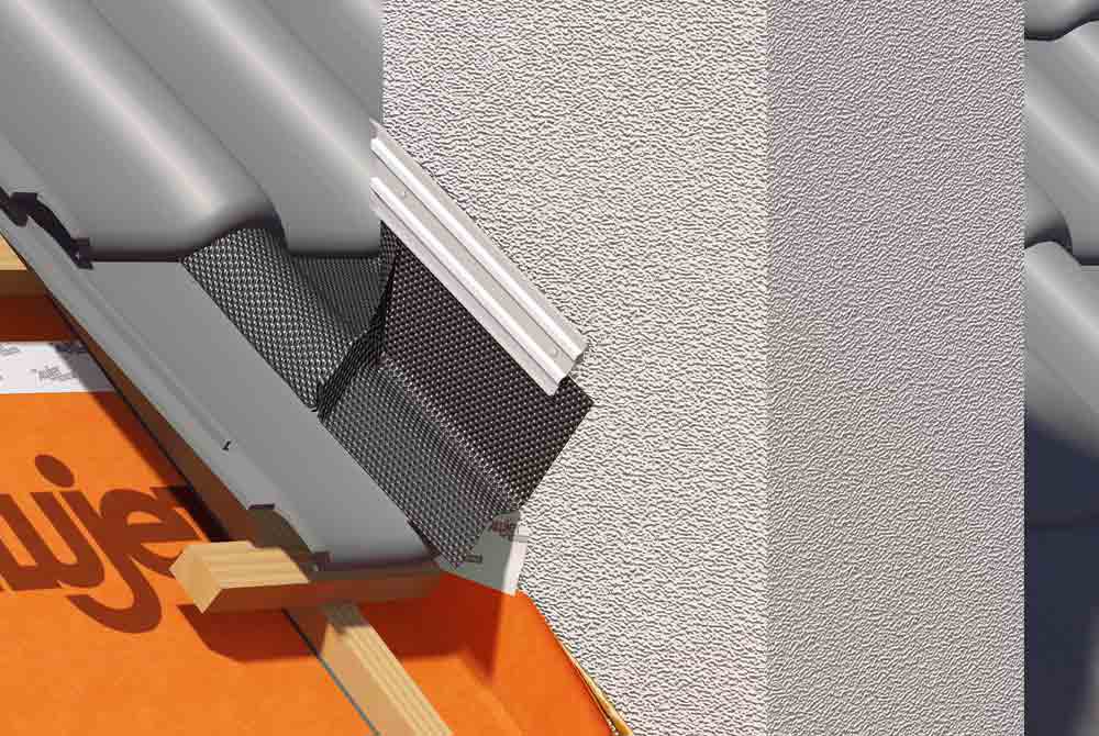 Die ALUJET Fixroll 3D wird eingesetzt, um regensichere Anschlüsse an aufgehenden Bauteilen wie Wand und Kamin im Bereich Steildach zu erstellen.