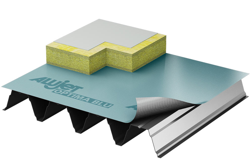 Die ALUJET Optima BLU ist eine 6-lagige praktisch dampfdichte Aluminiumverbundfolie fĂĽr den Einsatz im Bereich Dach.