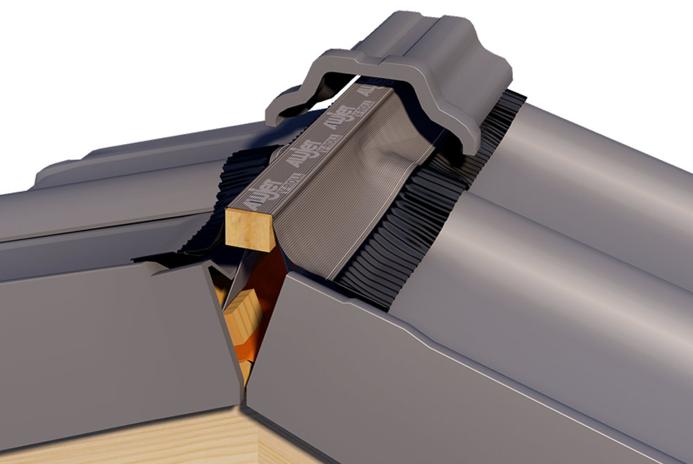 Die ALUJET V-Roll mit einem Glasgelegemittelteil wird eingesetzt zur Trockenfirst- und Trockengratverlegung.