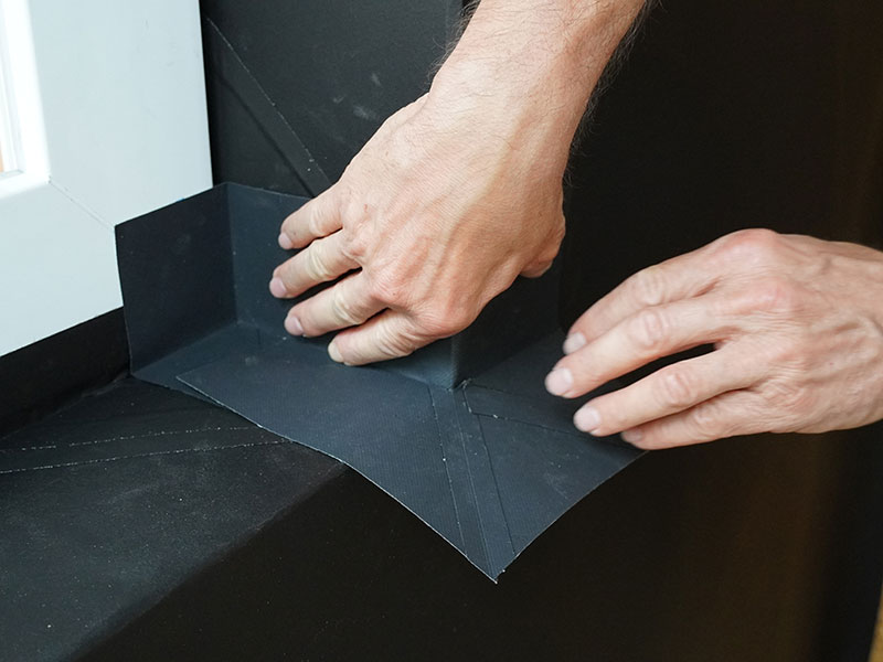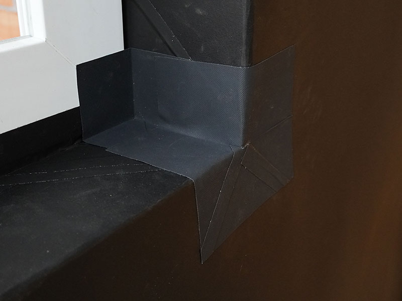 Vorgefertigte, selbstklebende Innen- und Aussenecke für das schnelle Erstellen eines dauerhaft wind- bzw. luftdichten und flexiblen Anschlusses von z. B. Fenstern, Türen usw. Trägermaterial aus UV-stabilem Vliesverbund für die Anwendung aussen.