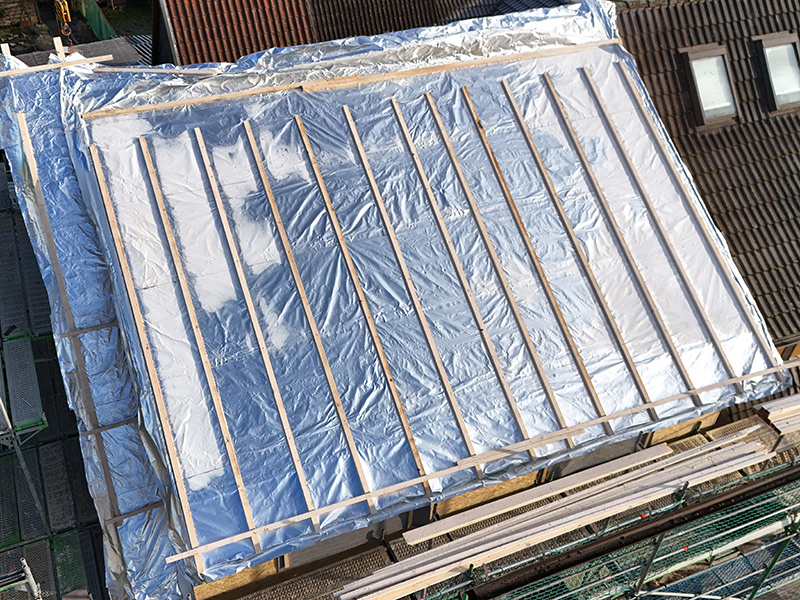 Auch das Aufkleben der Ampatop A silver plus auf Metallunterkonstruktionen in der Dämmebene geschieht mit Ampacoll Profix.