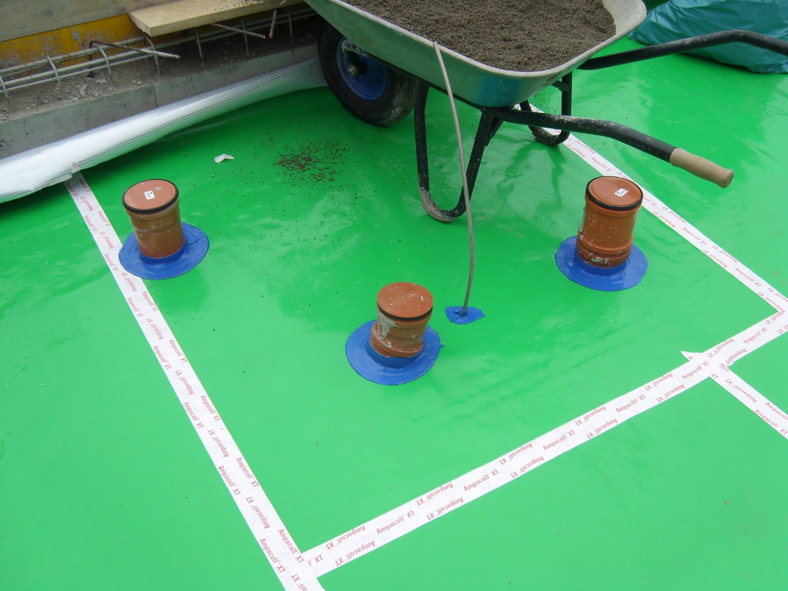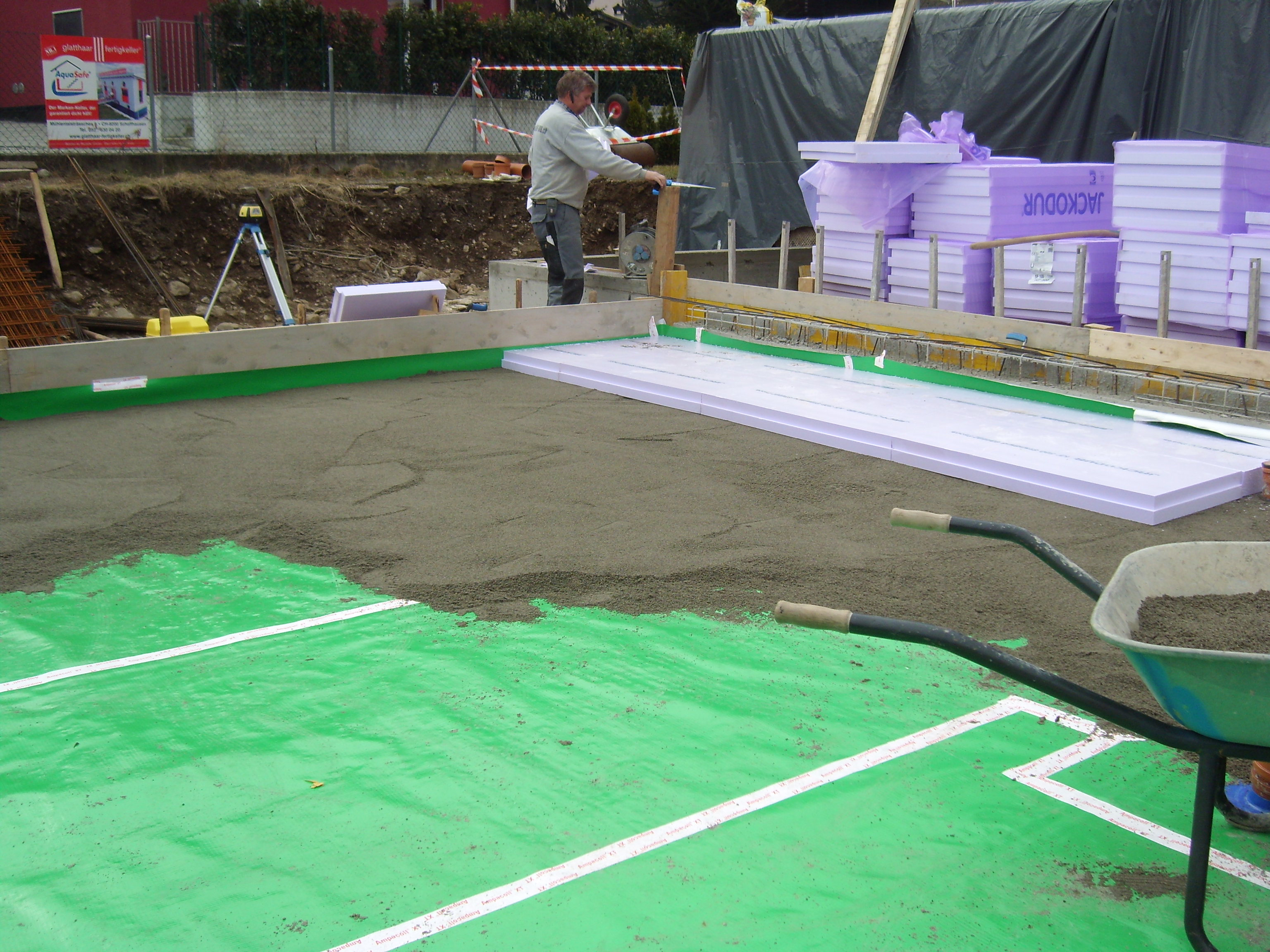Vierlagige Radonsperre, bestehend aus zwei Lagen PE-Folie, einem eingelegten Polyesterfasernetz und einer Aluminiumschicht mit 0,008 mm Dicke.