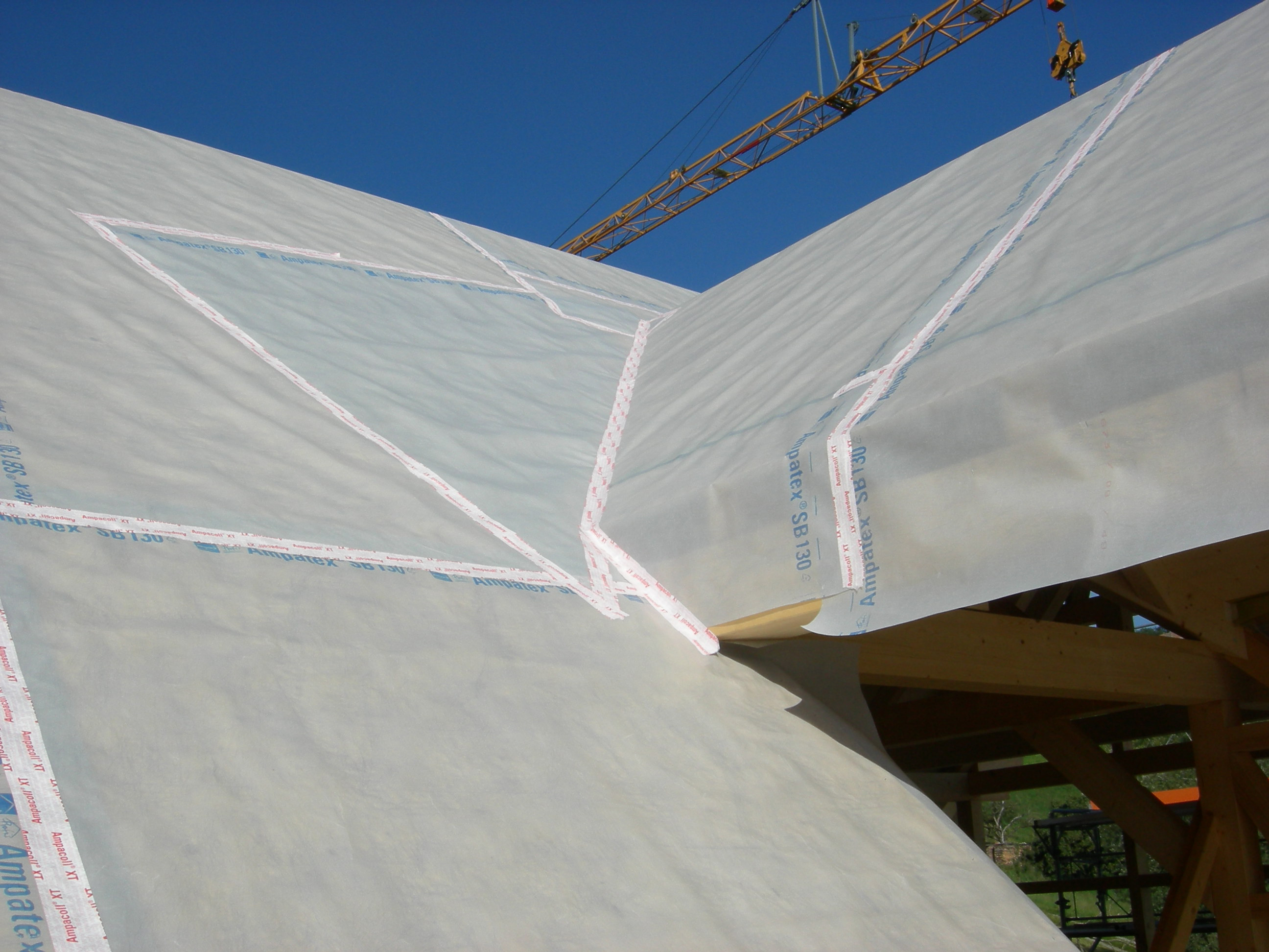 Zweilagige Dampfbremse, Luftdichtung und Schalungsbahn aus thermisch verfestigten Endlosfasern mit PP-Füllschicht (100 % Polypropylen). Freibewitterbar. Ideal für Aufsparrendämmung.