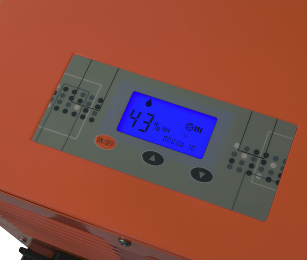 Fahrbar, digitales Bedienfeld mit integriertem Betriebsstundenzähler und ständig aktualisierter Luftfeuchtigkeitsanzeige, hygrostatgesteuert, mit auswaschbarem Luftfilter, Wasserbehälter und Schwimmerabschaltung sowie Schlauchanschluss für kontinuierlichen Wasserablauf, mit Rollkolbenkompressor und Kältemittel R 407 C (FCKW frei).