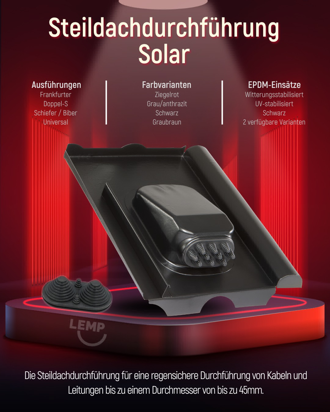 Die neue Steildachdurchführung aus feuerverzinktem Stahl ermöglicht eine regensichere Durchführung von Kabeln und Leitungen für Photovoltaik- und Solarthermieanlagen - robust, montagefreundlich und für den professionellen Einsatz entwickelt.