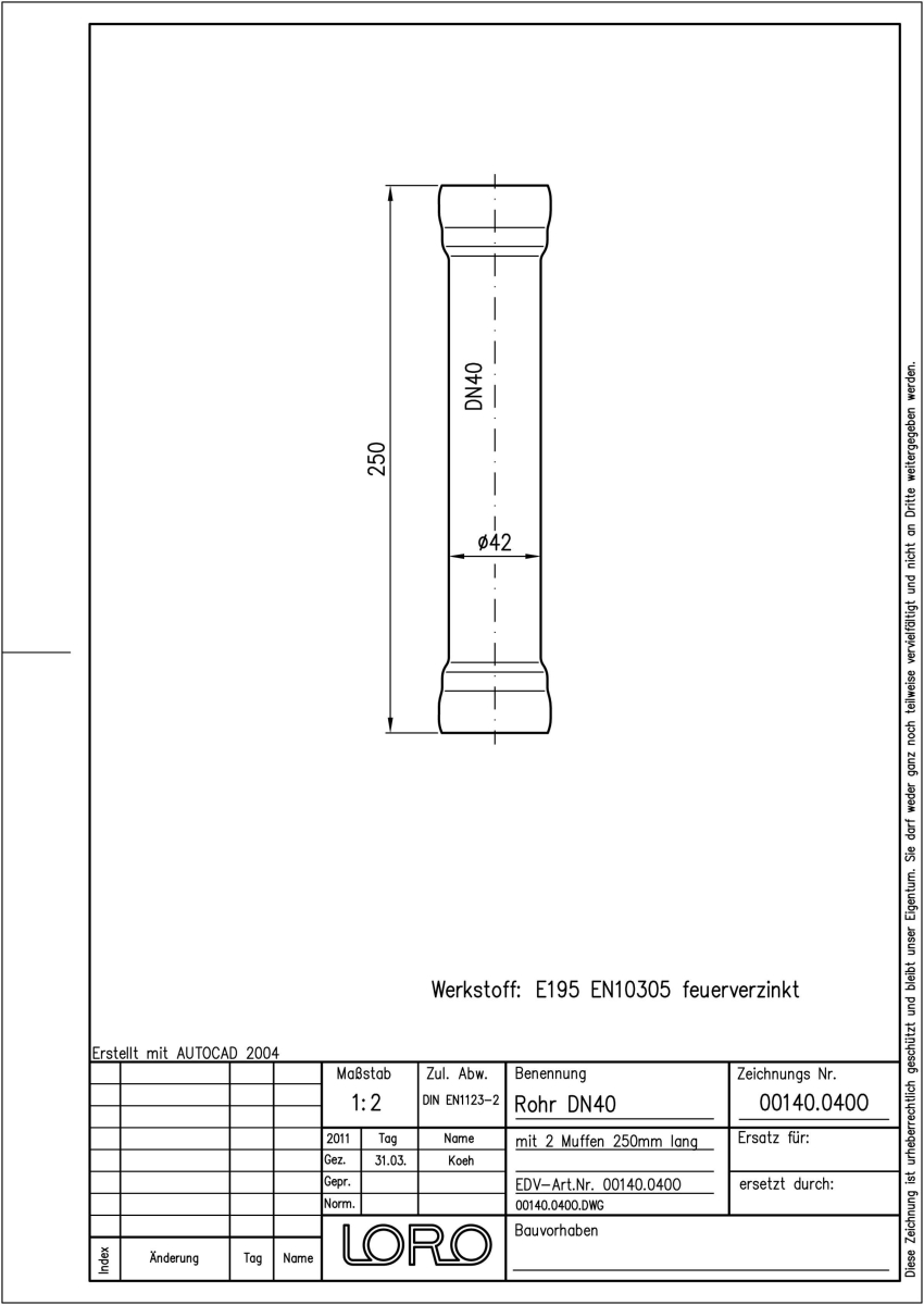 LORO-X Rohr, aus Stahl, feuerverzinkt, nach DIN EN 1123, mit erhöhtem Qualitätsstandard gemäß RAL-Gütezeichen GZ-694, mit 2-Kammern-Steckmuffenverbindung, für Füll- und Entlüftungsleitungen, Baustoffklasse A1, formstabil, bruchfest, rückstausicher, ohne Innenbeschichtung, 250 mm mit 2 Muffen, DN 40