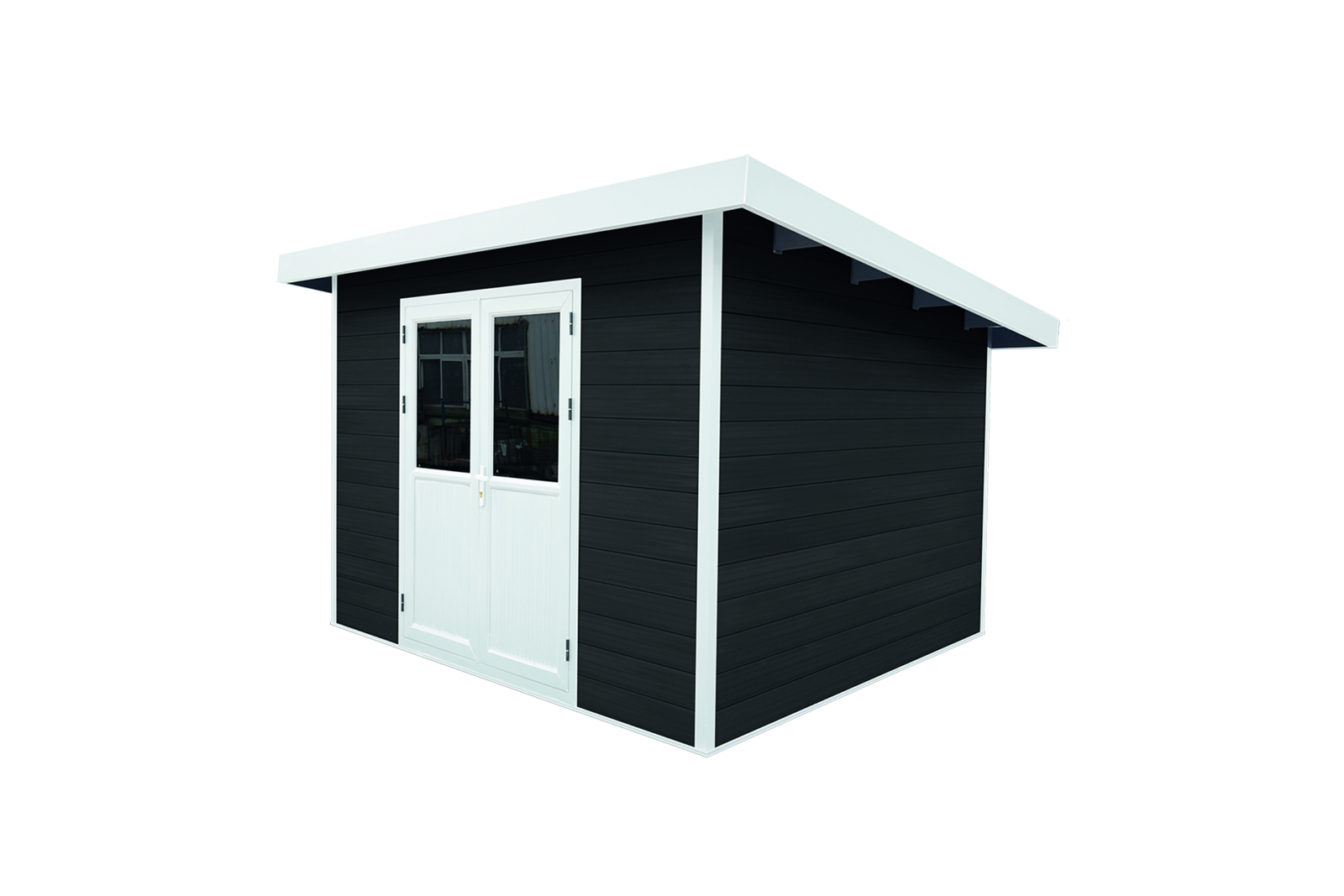 - Gartenhaus-Komplettsets aus WPC (Wände), Aluminium (Gerüst, Tür), PVC/ASA (Dach) und Glas (Fenster)