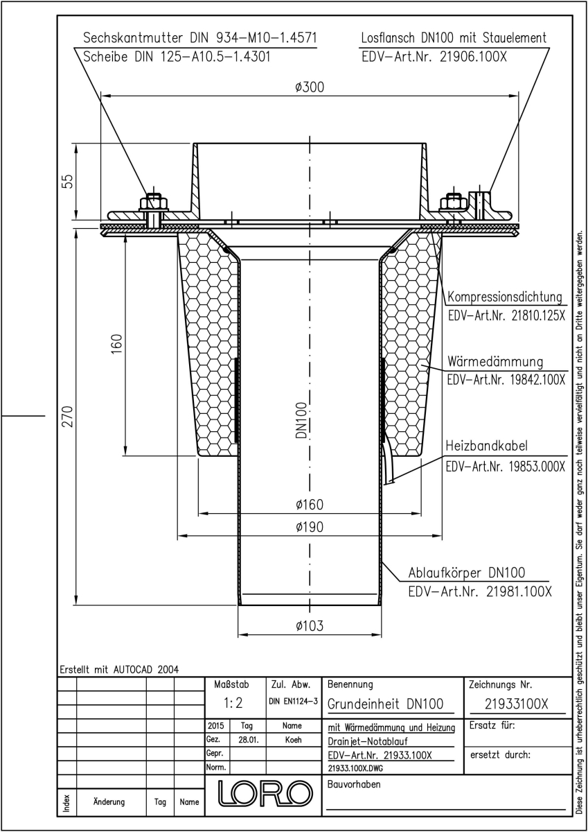 LORO-DRAINJET Flachdach Grundeinheit für Druckströmung, nach DIN EN 1253 mit erhöhtem Qualitätsstandard gemäß RAL-Gütezeichen GZ-694, Wehrhöhe 55 mm, mit Klemmflansch, als Los- und Festflanschkonstruktion, aus Edelstahl, Auslauf senkrecht, mit Wärmedämmung und Heizung, einteilig, bestehend aus Ablauftopf, Losflansch mit Stauelement, einschließlich Kompressionsdichtungen, DN 100