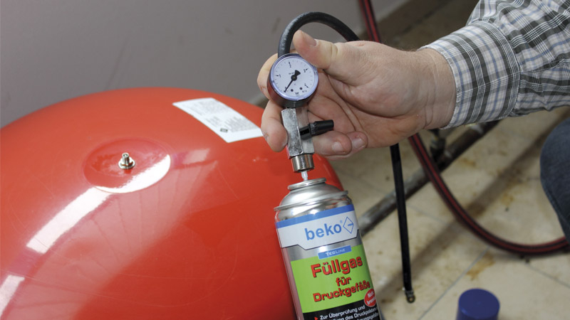 Prüf- und Nachfüllgarnitur für Membrandruckausdehnungsgefäße, bestehend aus 60 cm langen, flexiblen Füllschlauch mit Überwurfmutter Vg 8 zum Anschluss an das Ausdehnungsgefäß, mit Kugelhahn und Prüfmanometer 0/4 bar, Klasse 1,6