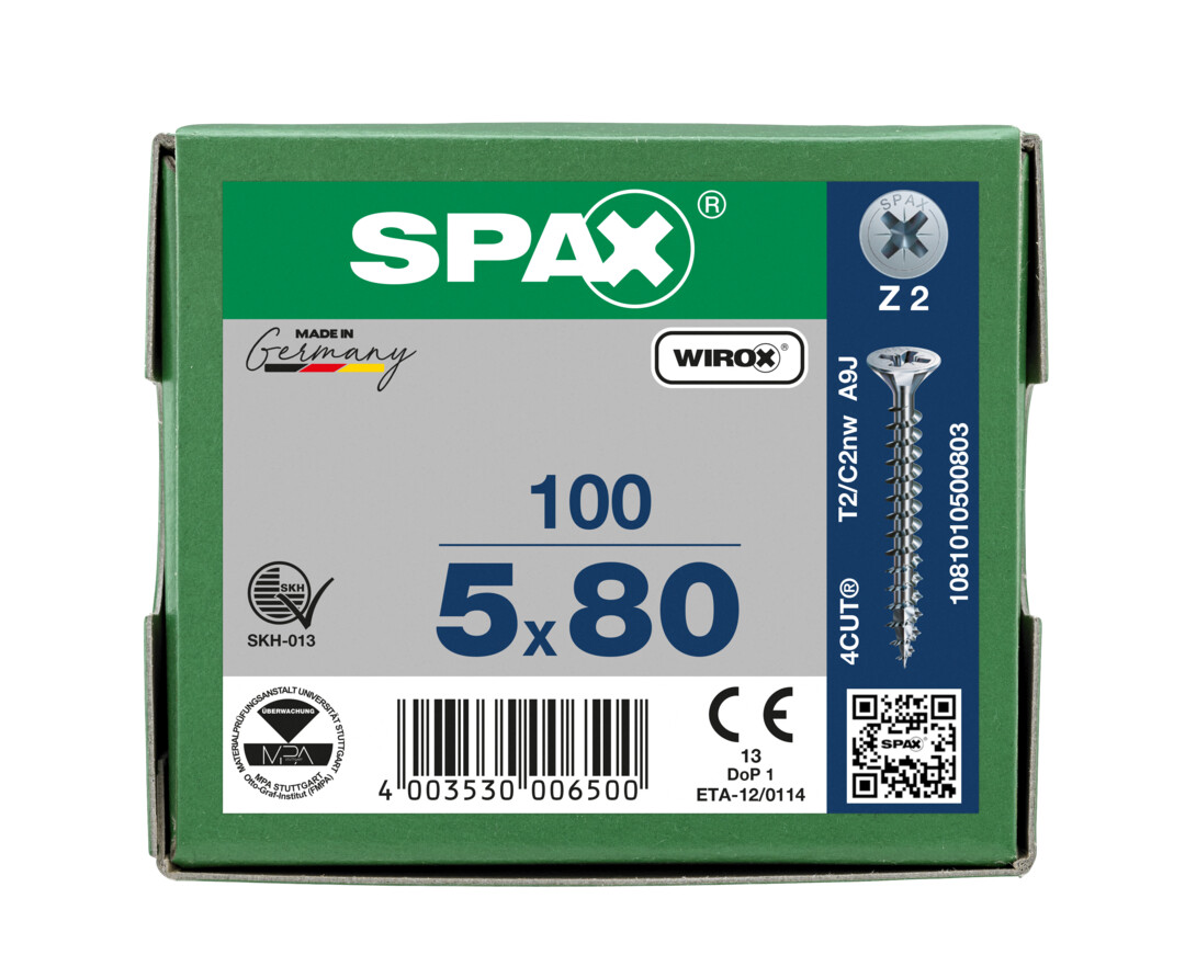 - 4CUT: Ohne Vorbohren (holzabhängig), ihre Spitze verringert wirkungsvoll die Spaltwirkung. Vierkant verdrängt die Fasern des Holzes und reduziert das Einschraubdrehmoment.