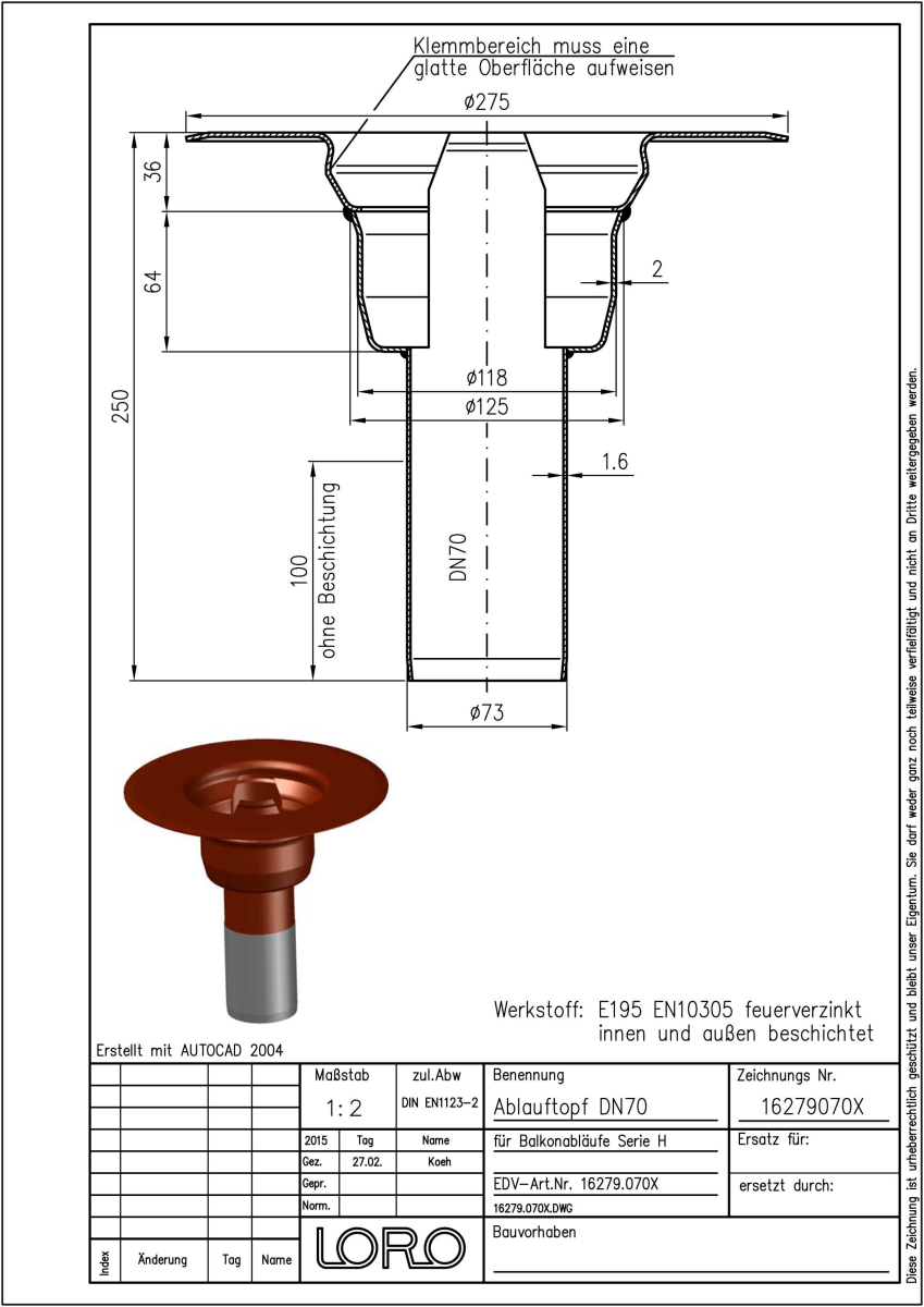 Serie H nach DIN EN 1253 mit erhöhtem Qualitätsstandard aus Stahl feuerverzinkt langlebige Innenbeschichtung gemäß DIN EN ISO 2178 auf Basis einer 2K-Epoxid-Kombination Farbton: Rotbraun senkrecht Fallrohrlänge 250 mm ohne Wärmedämmung als Einzelteil ohne Zubehör DN 70