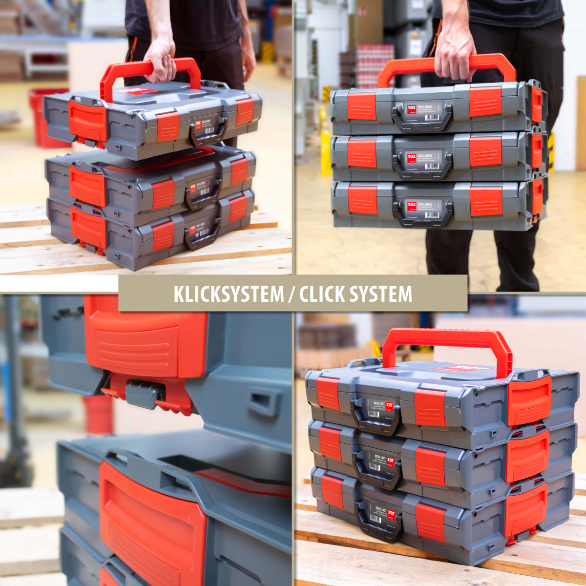 - Das patentierte Klicksystem erlaubt sekundenschnelles Verbinden und Trennen beliebig vieler BOXXen, auch unterschiedlicher Größen und somit einen kraft- und zeitsparenden Transport