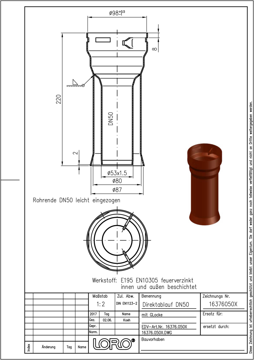 LORO-X Balkondirektablauf, Serie I mit Glocke, einteilig ohne Wärmedämmung, Auslauf senkrecht, nach DIN EN 1253 mit erhöhtem Qualitätsstandard gemäß RAL-Gütezeichen GZ-694, aus Stahl feuerverzinkt, mit langlebiger Beschichtung gemäß DIN EN ISO 2178 auf Basis einer 2K-Epoxid-Kombination, Farbton: Rotbraun, für Plattenstärke 220 mm, ohne Sieb, DN 50