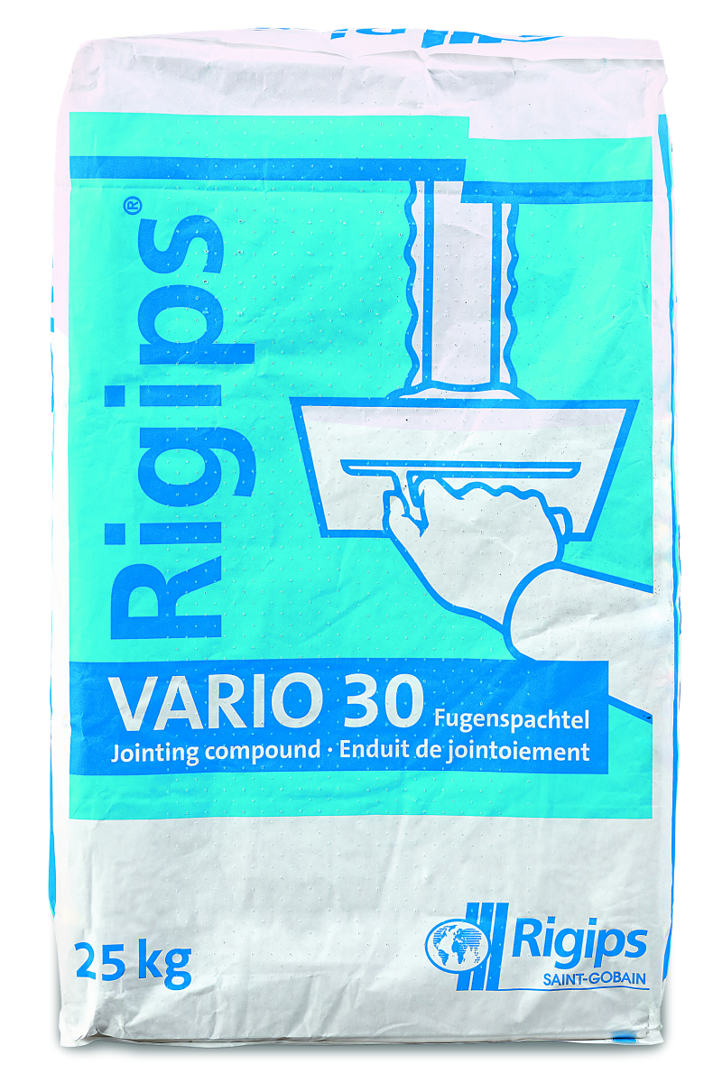 Der VARIO 30 Fugenspachtel von Rigips ist ein gipsgebundenes und hoch kunststoffvergütetes Fugenspachtelmaterial gemäß DIN EN 13963/Typ 4B. Er eignet sich für die Verspachtelung der Fugen und Anschlüsse von Rigips Platten. Je nach Fugenausbildung kann der VARIO 30 mit oder ohne Bewehrungsstreifen verarbeitet werden. Er eignet sich auch zur vollflächigen Nachspachtelung. Sehr gutes Haftvermögen.