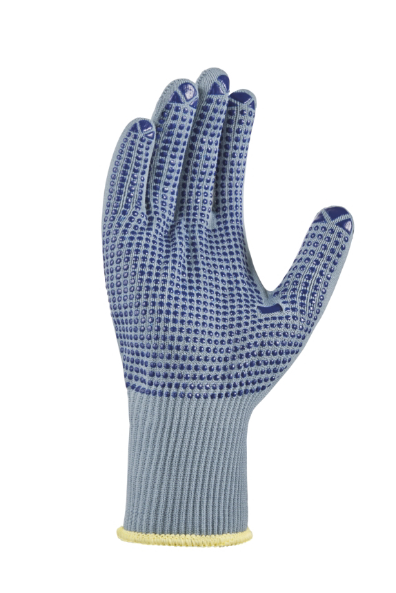 Nylon-Strickgewebe, mit einseitig aufgebrachten blauen PVC-Noppen auf den Handinnenflächen, Strickbund, ca. 13 Gauge (= 1,828 mm)