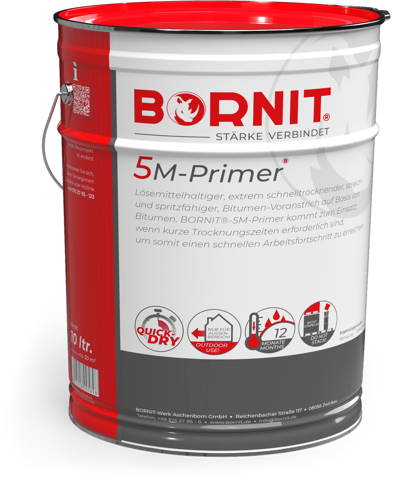 BORNIT®-5M-Primer ist ein extrem schnelltrocknender, streich- und spritzfähiger, lösemittelhaltiger Bitumen-Voranstrich auf Basis von Bitumen. BORNIT®-5M-Primer kommt zum Einsatz, wenn kurze Trocknungszeiten erforderlich sind, um somit einen schnellen Arbeitsfortschritt zu erreichen
