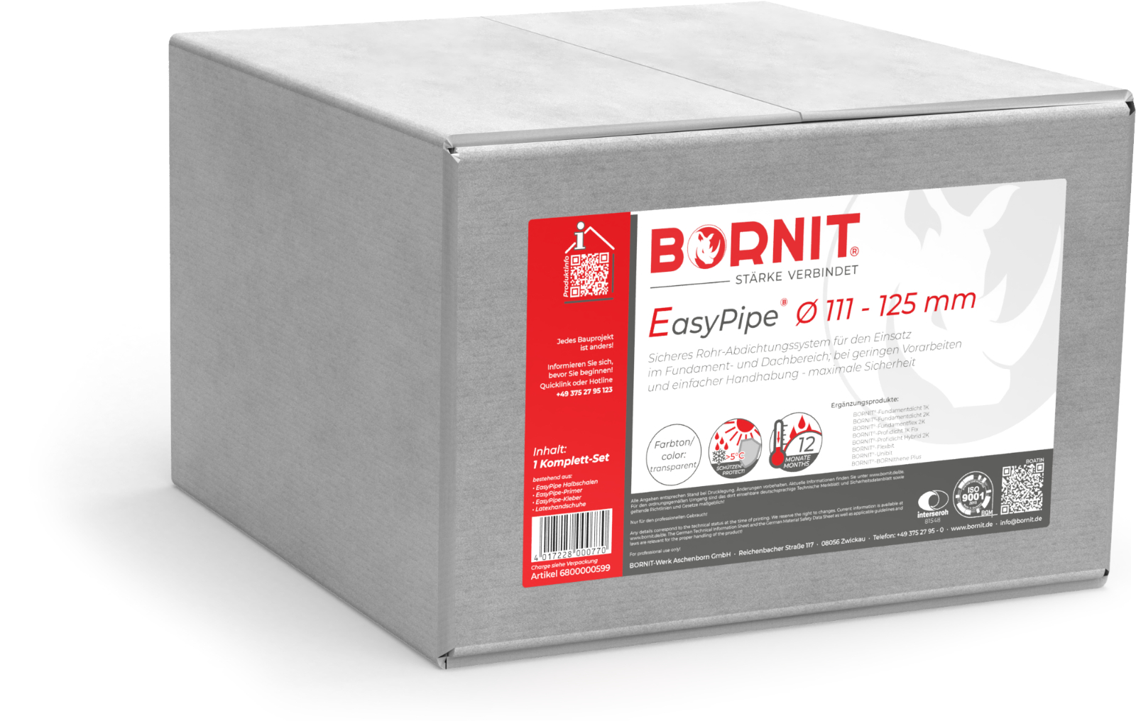 System bestehend aus der starren BORNIT®-EasyPipe-Manschette und dem BORNIT®-EasyPipe-Kleber (im Komplett-Set-Karton: incl. Einweg-Schutzhandschuhe und Einbauanleitung) zur sicheren Abdichtung von Rohrdurchführungen im Fundamentbereich sowie für Durchführungen im Dachbereich, einsetzbar in Verbindung mit den Abdichtungssystemen BORNIT®-Fundamentdicht 1K, -2K, BORNIT®-Fundamentflex 2K, BORNIT®-Profidicht 1K Fix, BORNIT®-Profidicht Hybrid 2K, BORNIT®-Flexbit, BORNIT®-Unibit, BORNIT®-BORNIthene Plus sowie allen BORNIT®-Dach- und -Schweißbahnen.